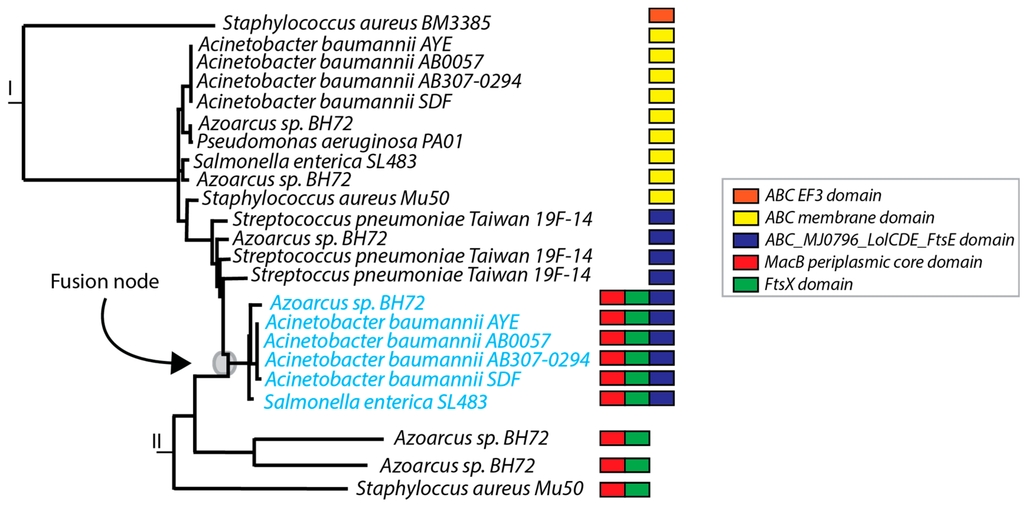 The need to appropriately depict this fusion gene’s evolutionary history led to the development of an N-rooted graph (Figure 5). The two maximum likelihood trees generated on Seaview were arbitrarily rooted and manually merged using the Adobe Illustrator software. This graph contains two roots, which can properly represent the evolutionary history of these genes. The approximate location of the fusion event is also indicated. The resulting graph provides a more complete picture of the evolutionary history of the fused genes. Guided by the topology of the two phylogenetic trees (Figure 5) it was possible to link the position of the fusion event between the two parents: I and II. Branch lengths are based on the maximum likelihood estimation. An obvious question arising from this graph, is whether the genes containing the MacB and FstX domain were the only versions capable of fusing with genes containing the ABC_MJ0796_LolCDE_FtsX domain. There are no observations of fusions with genes containing the ABC_membrane and ABCF_EF-3 domain. The sample is obviously small, but nonetheless, N-rooted fusion graphs can be used to generate testable hypotheses concerning the determinants of fusion.