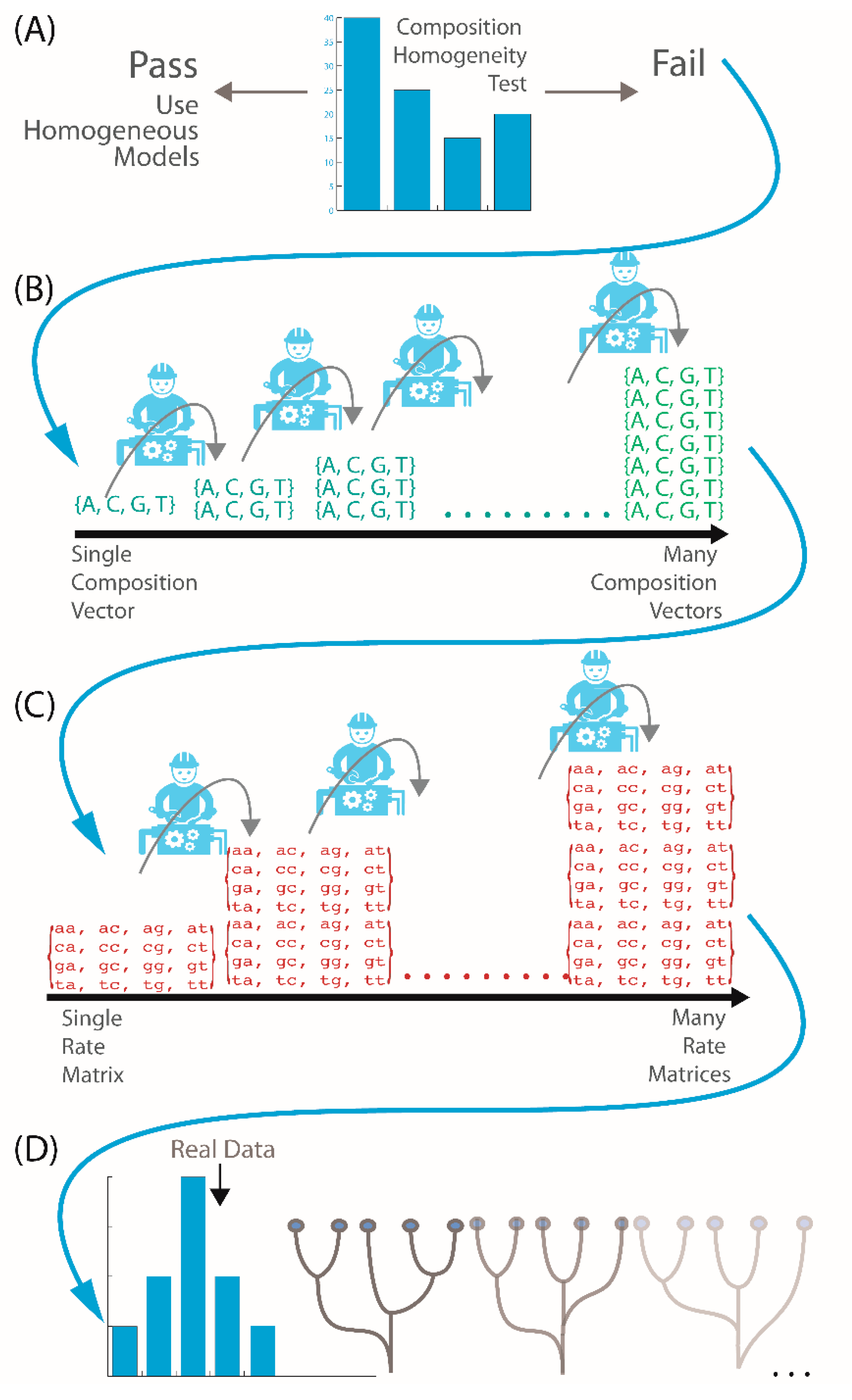 A flowchart of the steps involved in phylogenetic reconstruction using heterogeneous models. All the major steps we have described in performing a phylogenetic reconstruction using heterogeneous models are summarized here. (A) Starting with a multiple sequence alignment, the test for compositional homogeneity is carried out. Failing this test means the data must be modeled using a heterogeneous model. There are two phases to generating the heterogeneous model of best fit in P4 these are depicted in (B) and (C); (B) The first phase estimates the number of composition vectors needed for the dataset; (C) The second phase estimates the number of exchange rate matrices; (D) Depicts the assessment of the model adequacy using posterior predictive simulations and the generation of the trees from which a consensus tree is generated.