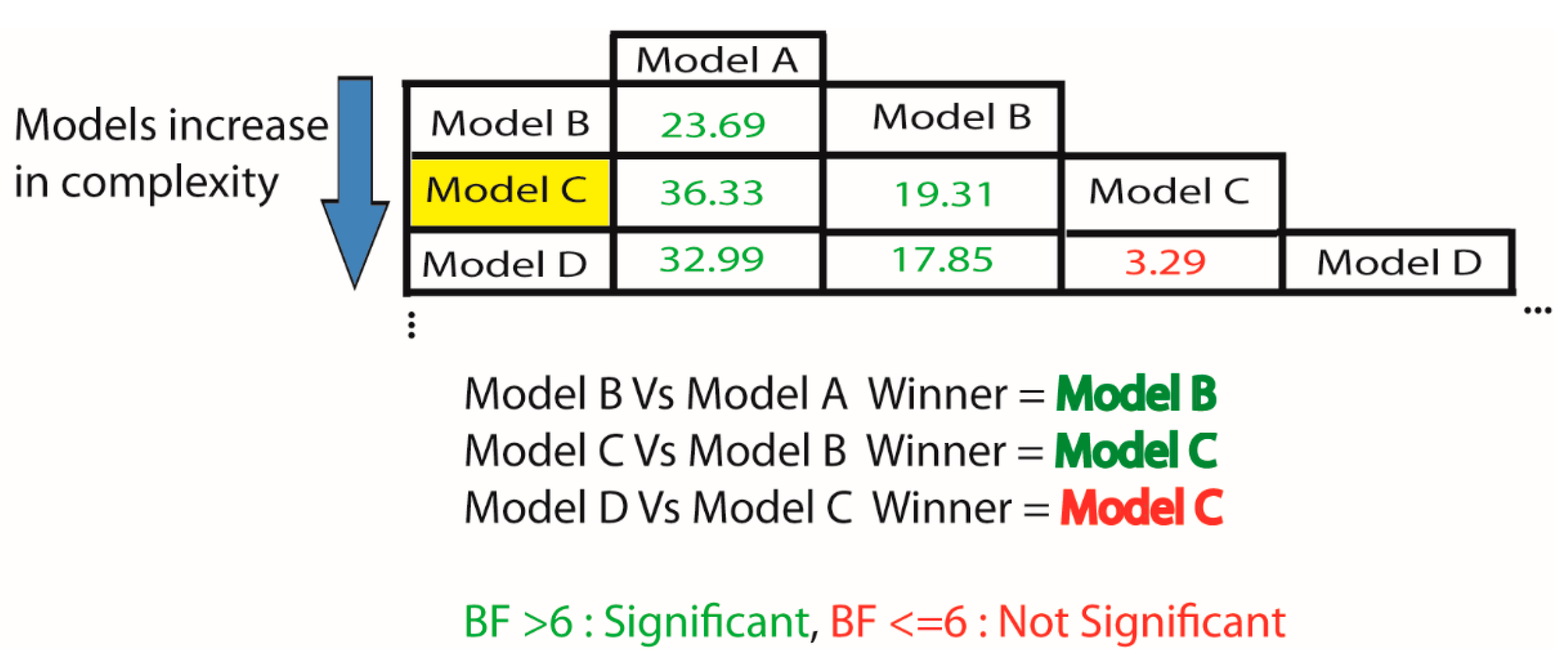 Overview of a sample Bayes factor analysis. Models are denoted as A, B, C and D and parameters increase from A to D (i.e., Model A is the least parameterized model). They are compared in a pairwise manner as denoted by the lower triangular matrix. Each pairwise comparison results in a score (or Bayes Factor) by calculating 2[lnL(Model B) − lnL(Model A)]. Significance is based on the Kass and Raftery equation [79]. Cases where the Bayes Factor comparison yields a significant result are shown in green and models that do not significantly improve the fit to the data are given in red. Model C is selected as the “best-fit model” as an increase in parameters in Model D does not significantly improve the model fit. Therefore we do not continue to search more parameter rich models and we choose Model C (highlighted in yellow).