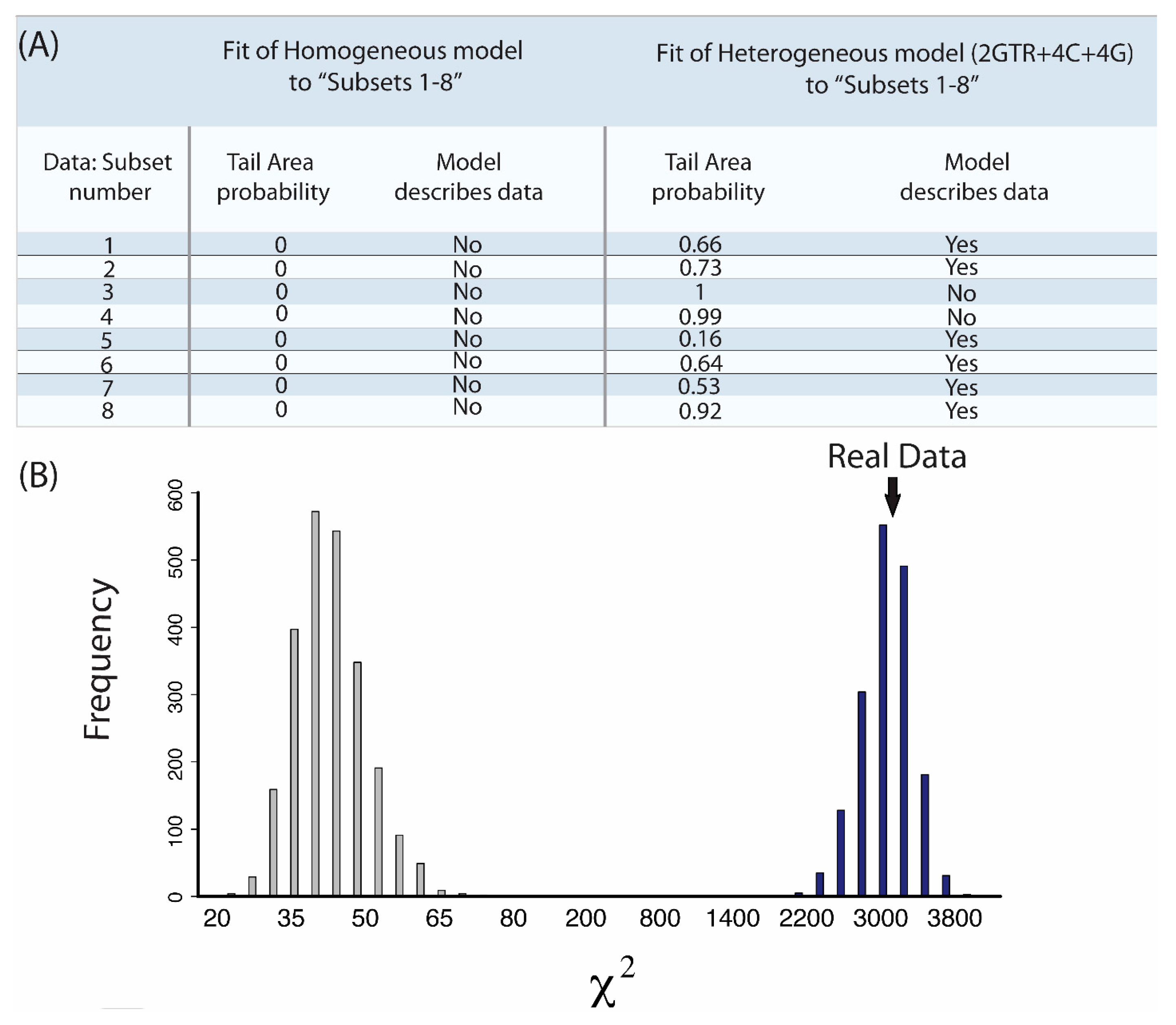 Assessment of fit of Homogeneous and Heterogeneous models for “Subsets 1–8”. (A) Posterior predictive simulations for the “Subsets 1–8” are shown. The leftmost section of the table shows the results for the homogeneous model. The rightmost section of the table shows the improved tail area probability on modeling the data with heterogeneous models. Values closer to zero represent a poorer fit of the model to the data; (B) The results of the posterior predictive simulations for one subset (Subset 1) are shown in detail. Again the simulation for the homogeneous GTR model is shown in grey and the heterogeneous P4 model of best fit is shown in blue (i.e., 2GTR + 4C + 4G). In both simulations the X-axis represents the parameter of comparison taken from the simulations, and the Y-axis represents the frequency. The large black arrow indicates the value of test statistic (χ2) retrieved from the real data.