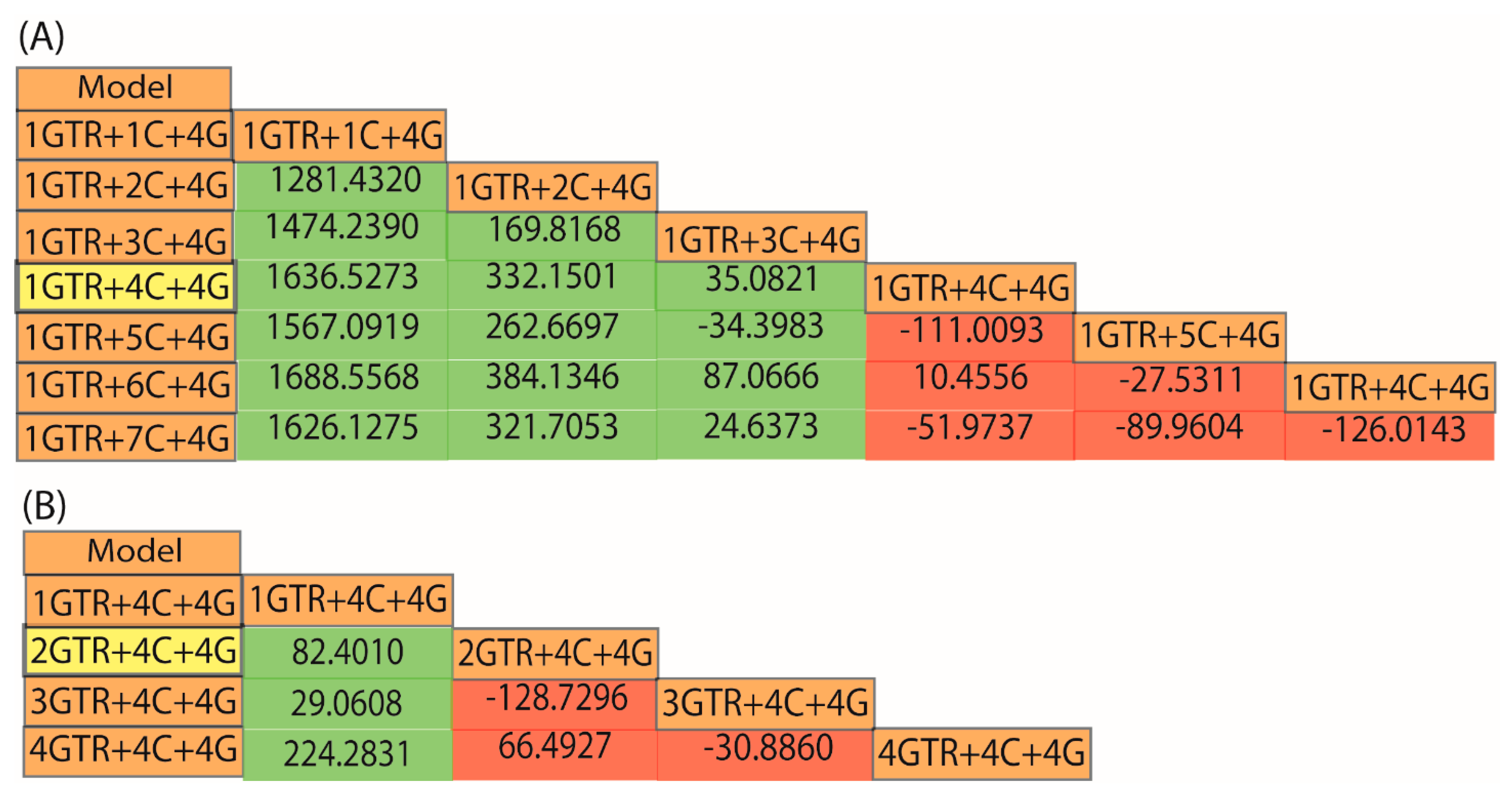 - Nylander, J.A.A. MrModeltest v2. Program Distributed by the Author; Evolutionary Biology Centre, Uppsala University: Uppsala, Sweden, 2004. [Google Scholar]