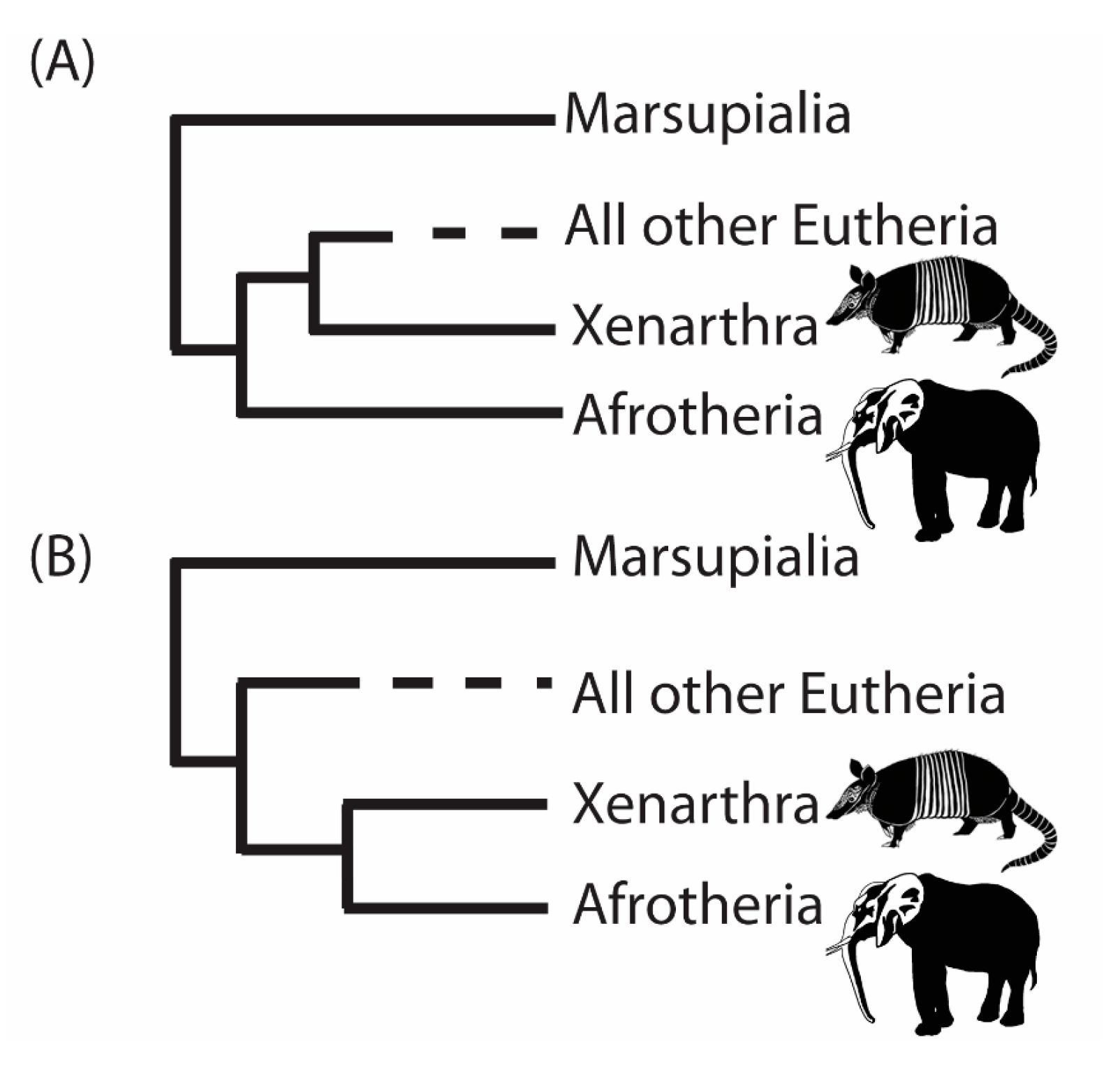 Placing the root of the placental mammal tree has been a controversial topic [82]. Many studies have concluded conflicting positions, sometimes even from the same pool of data [7,64,83,84,85]. In 2013, two molecular studies narrowed down the root of the placental mammal phylogeny to one of two possibilities: (i) an Afrotherian root which places mammals such as elephants as the earliest diverging placental mammal group [85]; and (ii) an Atlantogenata root, placing the common ancestor of the Xenarthra (e.g., armadillo) and Afrotheria as the earliest diverging placental mammal group [7].