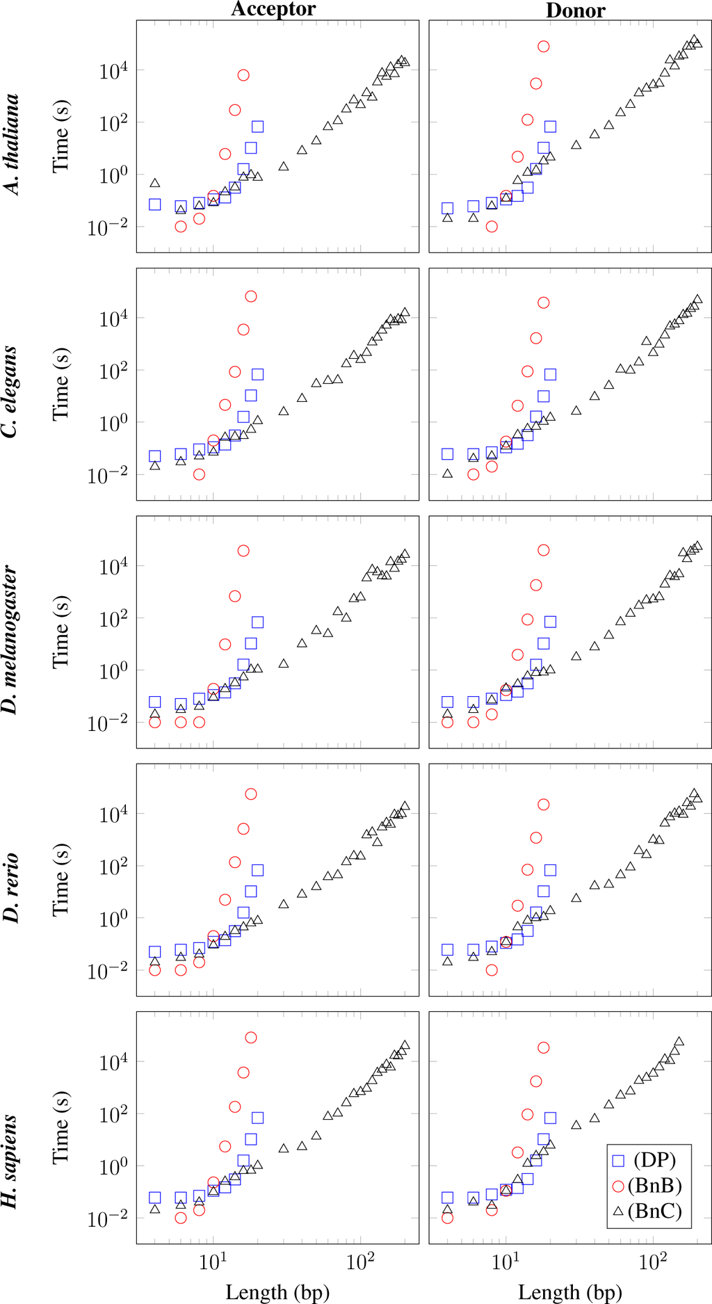 Here, we investigate the performance of this algorithm and two other exact algorithms for learning PM models and PVLM models of order two for RNA splice sites. Specifically, we investigate the performance of these three algorithms for ten datasets of splice acceptor sites and splice donor sites of five different species by measuring their running times for increasing lengths of the studied RNA splice sites until the running times exceed 1.5 × 105 seconds (s), corresponding to approximately two days.