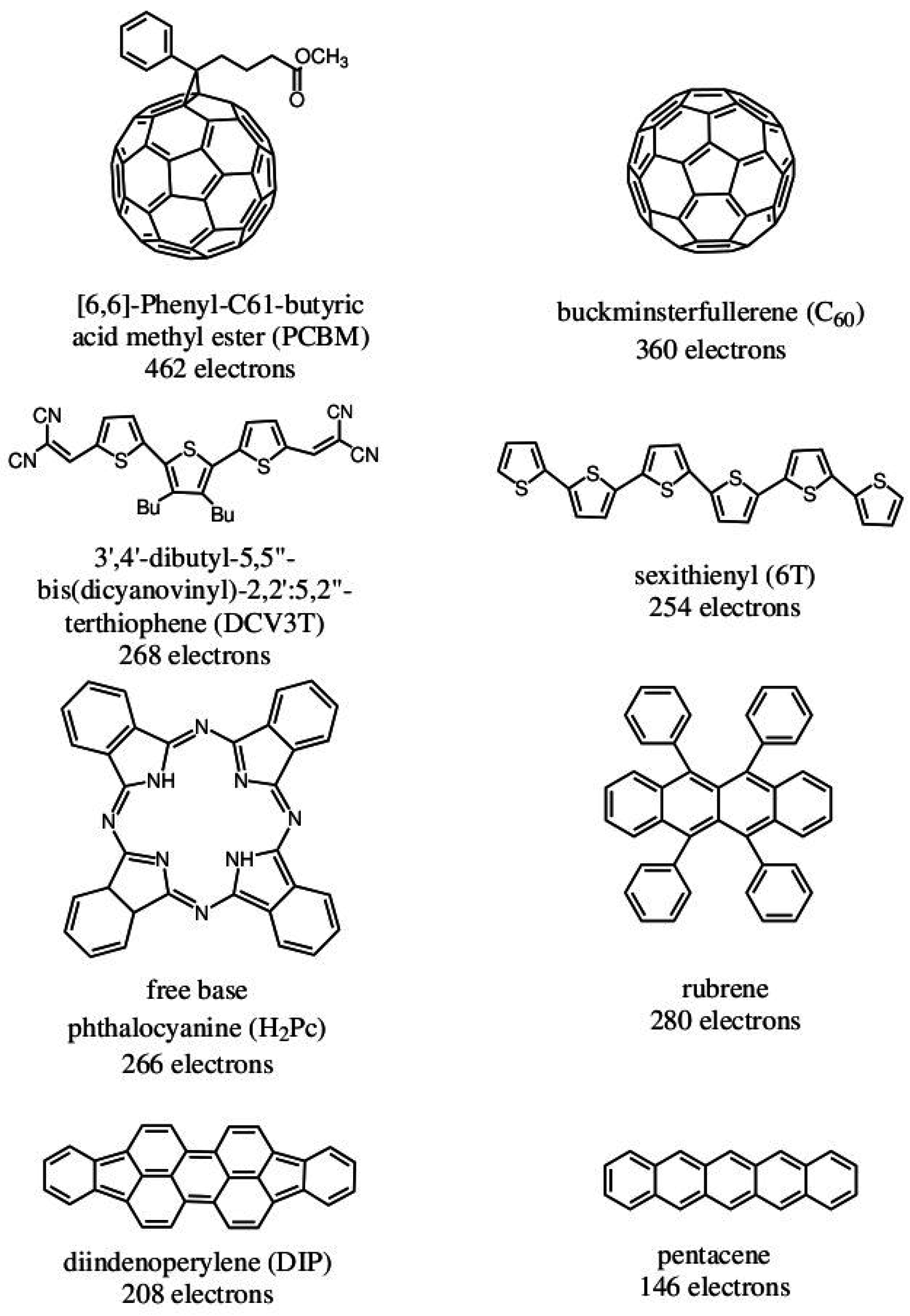 Figure 1. Eight typical molecules that are often used as acceptors or donors in organic electronics.