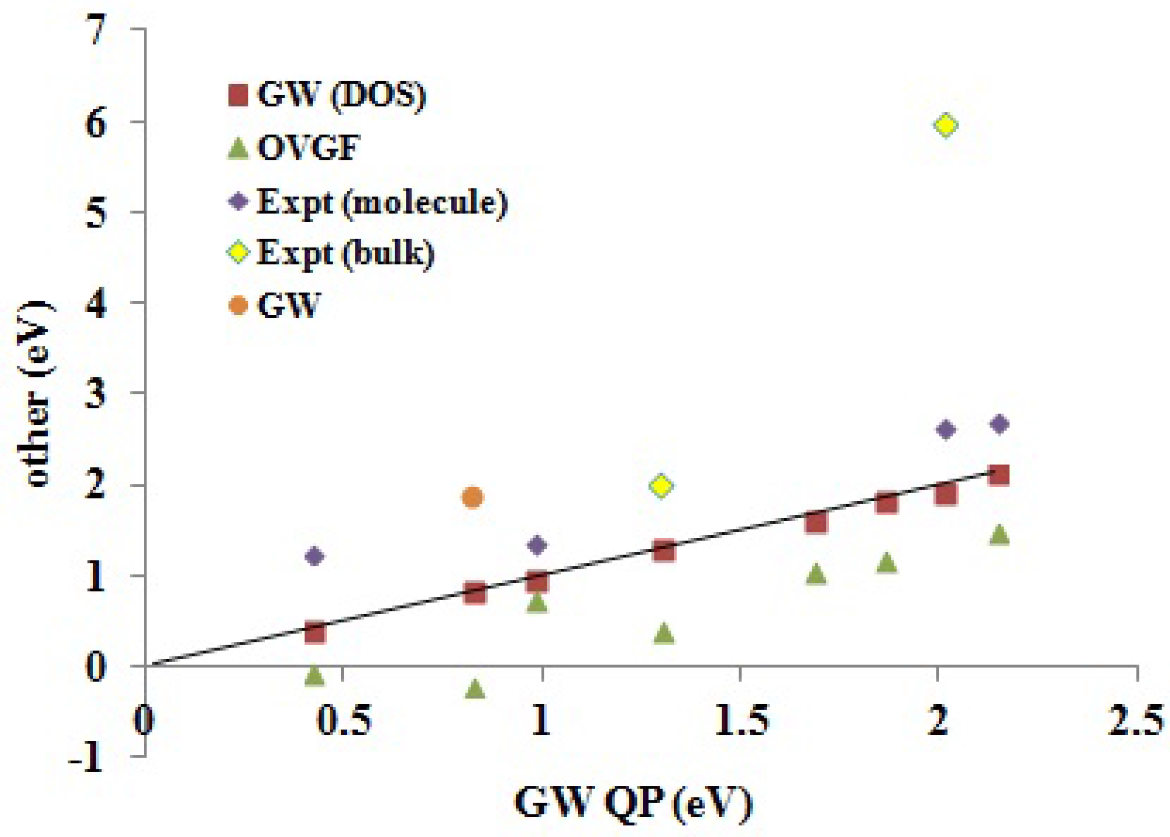 We have chosen a different approach to assessing the accuracy of DFTB here by choosing to compare DFTB IPs and EAs against first-principles G W values. The advantage of this approach is that experimental IPs and EAs for large molecules are often extracted from condensed phase (bulk, thin film or solution) measurements, introducing uncertainties when it comes to trying to extract molecular values. We will show that our G W calculations do indeed give good IPs when compared to experimental IPs for medium-sized molecules, and we will then assume that this is also true for the other medium-sized molecules, where molecular IPs are not available and also for EAs. Taking the G W values as the “true values”, we then calculate error bars on the DFTB estimate of the G W values.