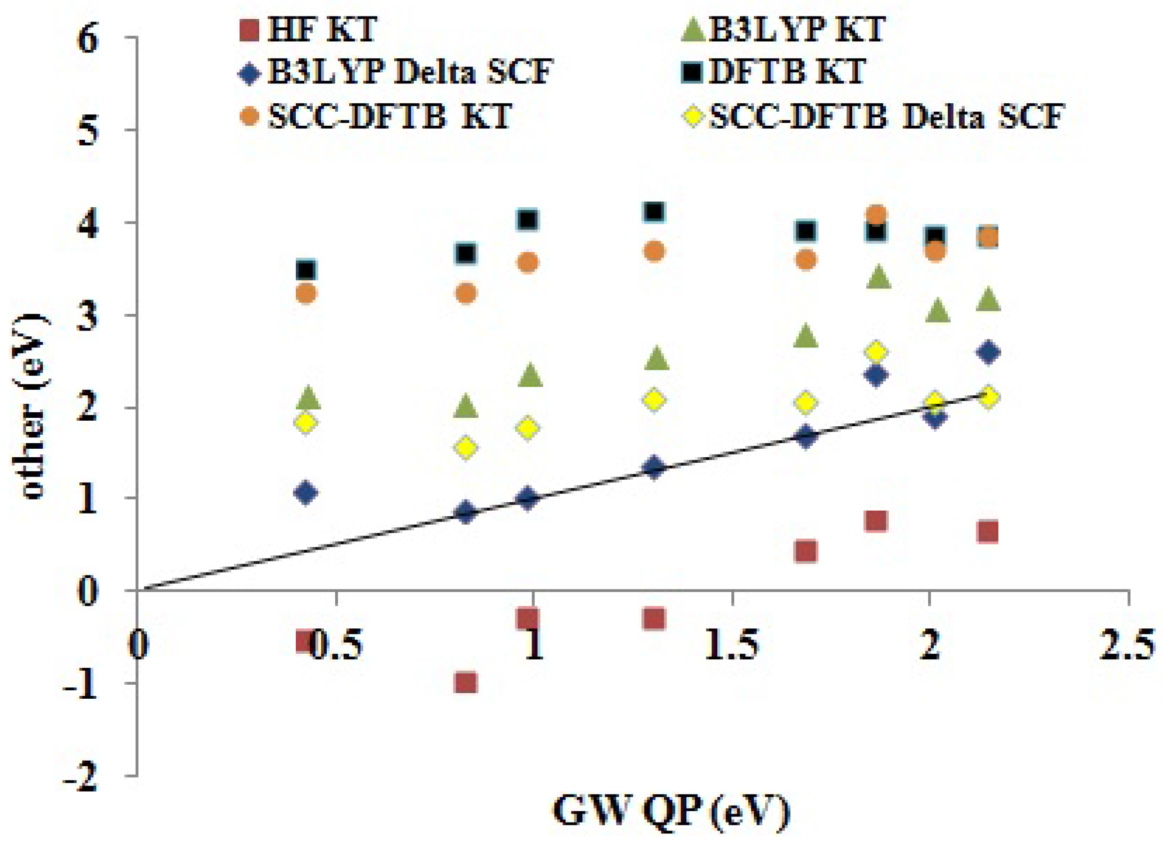 The rest of this paper is organized as follows: the next section gives a brief review of the basic electronic structure methods used in this paper. Section 3 provides computational details. Section 4 goes on to describe and apply our analytical procedure for assessing the quality of DFTB IPs and EAs for the case of small molecules where good and theoretically well-understood experimental data are available. This gives us a useful first indication of how DFTB might work for the case that really interests us, namely for larger molecules of interest in organic electronics. Section 5 then extends our analysis to a set of medium-sized molecules typical of organic electronics. The assessment is complicated by the dearth of theoretically well-understood experimental data. We show that this dearth of experimental data may be compensated by high-quality G W calculations, which agree well with available experimental data, and best when for gas phase data, where the comparison is cleanest. We therefore use the G W results as our benchmark for evaluating DFTB IPs and EAs for medium-sized molecules. Section 6 provides a concluding discussion.
