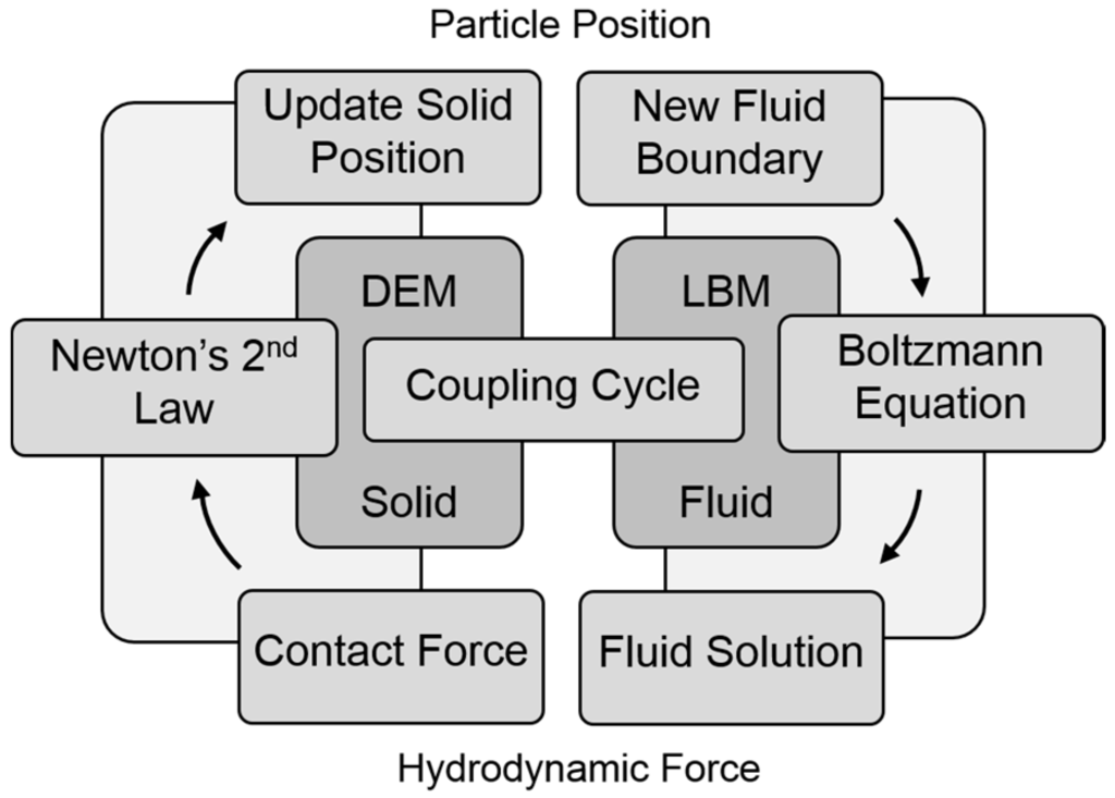 where is particle mass, the total force acting on it, the rotation inertia, and is the total torque. In this work the explicit Verlet algorithm is applied, which is often used in DEM and MD simulation [42]. LBM-DEM coupling at each time step is realized by computing the fluid field by LBM firstly and then the hydrodynamic force and contact force between solids are calculated. Finally, different external forces are added together to update the particle position by integrating the above differential equation. The computation of LBM-DEM coupling is shown in Figure 1.