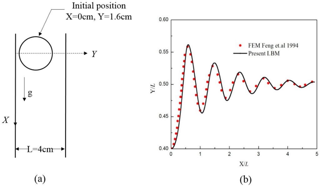 The benchmark case of single particle sedimentation. (a) The geometry of the simulation; (b) the comparison of particle trajectories.