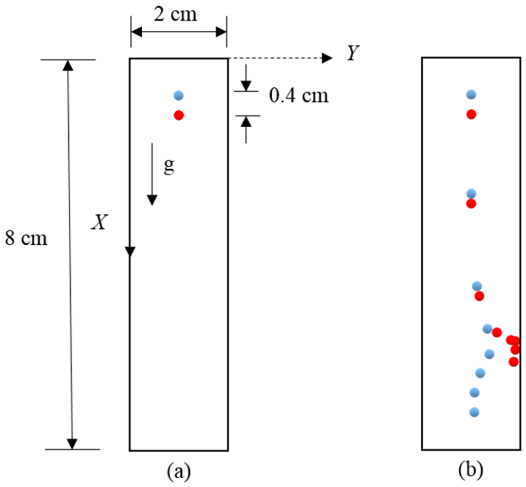 For further validating the program, two-particle sedimentation is simulated. The channel geometry is shown in Figure 3a, where the width and length of channel are 2 cm and 8 cm, respectively. The fluid has the properties of water with kinematic viscosity 10−6 m2/s and density 1000 kg/m3. The diameter of particle is 0.2 cm, and particles density is 1010 kg/m3. The first particle is at 0.999 cm and 0.8 cm in Y and X direction, respectively. The second particle is at 1.0 cm and 1.2 cm in Y and X direction, respectively. For comparison, all these parameters are the same as those in [46,47]. Initially, the two particles are released with a zero velocity, and the upper one will settle in the wake of the other, which leads to the rearrangement mechanism called “drafting, kissing, and tumbling” or DKT motion [48]. Drafting means the particle in the wake will accelerate with an increasing acceleration owing to the low pressure in the wake. Then two particles contact with each other, which is called kissing. Due to the instability of contacting particles aligned in the direction parallel to the motion, they tend to “tumble” to another position. As a result, the center line of particles rotates an angle, and eventually the two particles depart from each other due to the unsymmetrical wake [48].