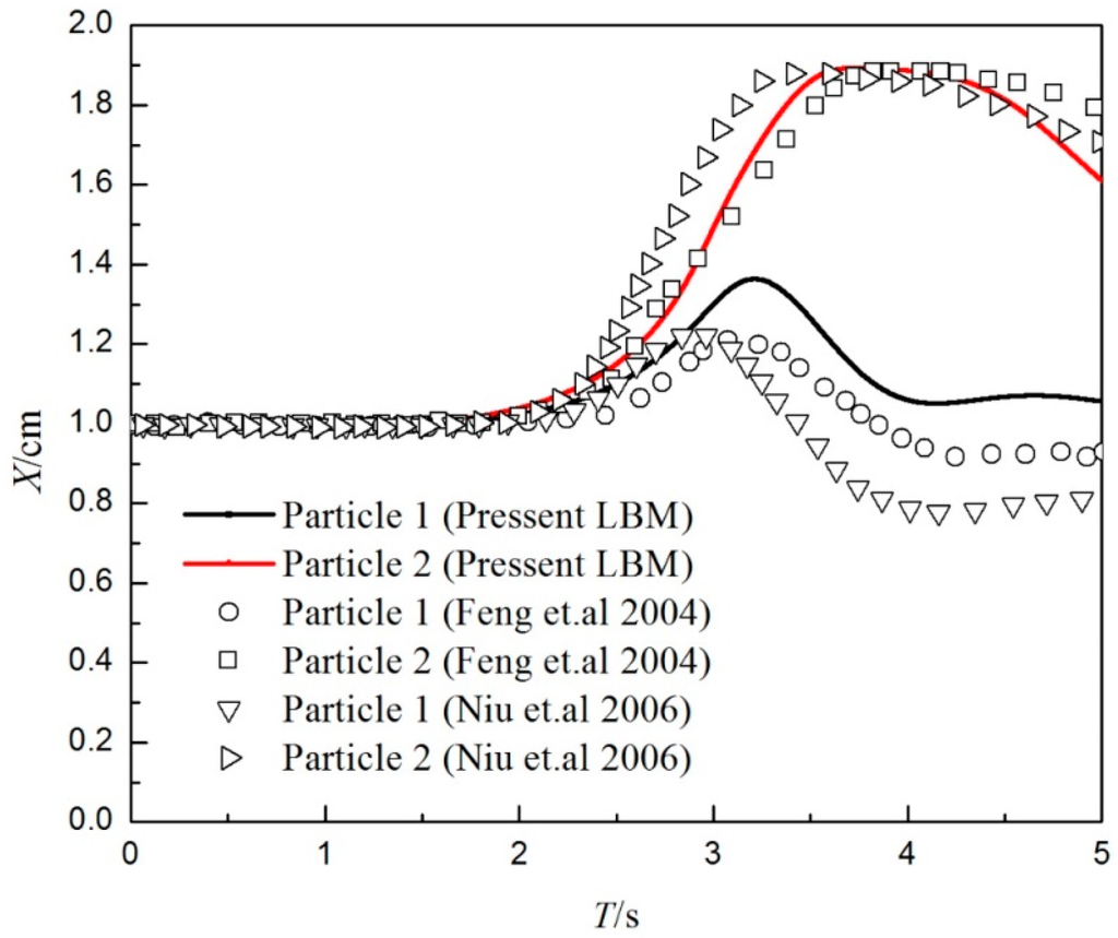 As show in Figure 3b, our result captures the rearrangement mechanism of “drafting, kissing and tumbling”. Furthermore, the quantitative comparison of particle trajectories in Y direction is presented in Figure 4, which shows that before particles collision our result agree well with that in [46,47]. After kissing stage, exact agreement may not be expected due to different discrete methods are used [47].