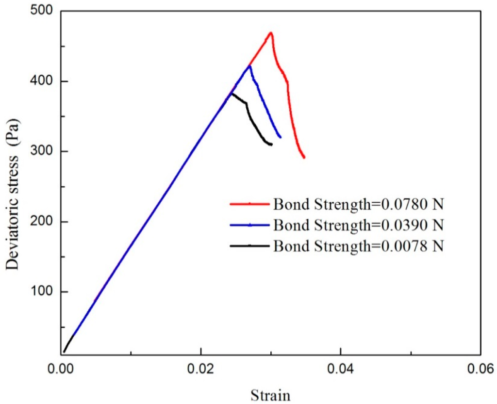 The deviatoric stress–strain responses of cemented granular media in biaxial compression simulation.