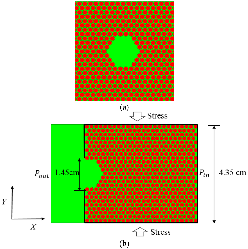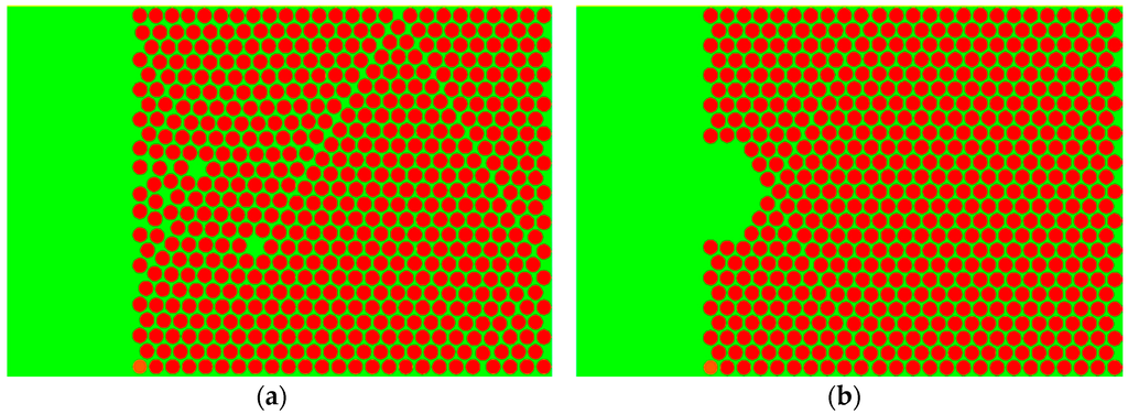 Firstly, the rectangular DEM samples are bounded by four frictionless rigid walls as in Figure 5a. For capturing the bonding effect in cemented granular media, the contact bond model is added to the particles contacting with each other. In the simulation, three samples are considered, which have the same micro parameters except bonding strength. Due to the limitations of pressure differences that can be applied when using LBM, the samples used in the biaxial compression simulation and sand production simulation have a higher deformability and smaller strength than the real materials, which is a common consideration on simulating sand production by LBM-DEM model [23]. Based on this principal, the main DEM parameters used in biaxial compression and sand production simulation are chosen empirically and summarized in Table 1.