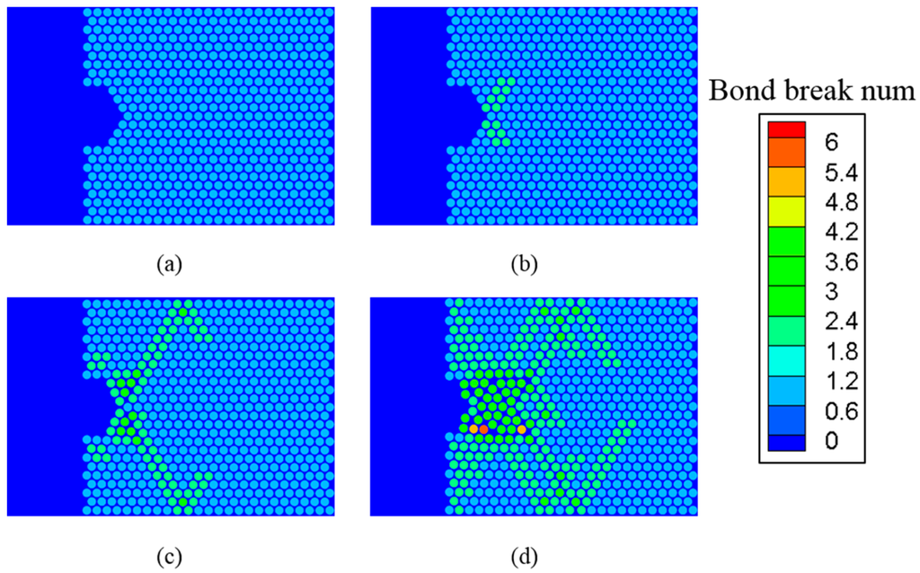 Figure 10 shows the damage evolution of the cemented sample with bonding strength of 0.078 N under the effective stress and flow erosion, where the color of the sand grain represents the number of bond breakage, and the warmer the color is, the more bonds on the sand grain are broken. Initially, the sample is intact with no bonding breakage (Figure 10a). With the increase of the strain, the bond near the cavity begins to be broken owing to the concentration of effective stress, and some small cracks forms in this zone (Figure 10b). Then, these small cracks propagate into the sample, which leads to the localized failure near the cavity (Figure 10c). Eventually, the flow erodes the localized failure zone and transfers the loose sand grains into the cavity (Figure 10d). It is observed that the experimental observation “initial sand production is evoked by localized failure” in [5] is examined by our simulation. What is more, although the localized failure is serious near the cavity, the zone far from the cavity is still intact, which means that sand production occurs well before macroscopic failure, just as the experimental observation by X-ray CT photographs in [5].