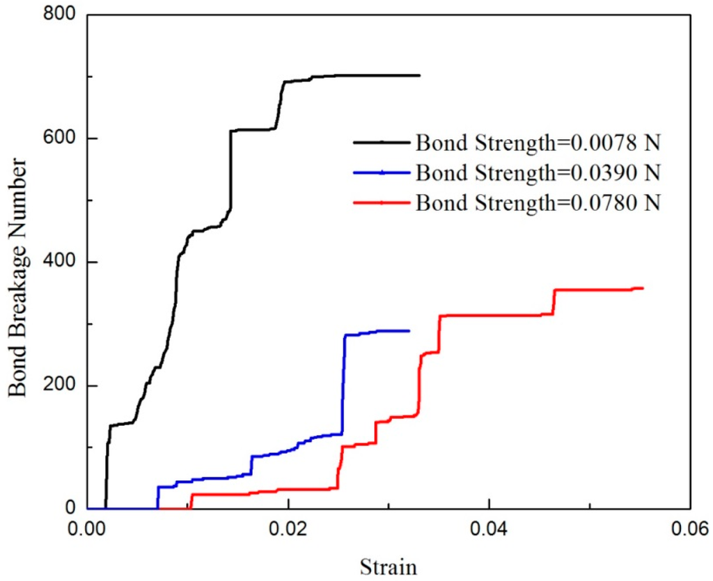 The deviatoric stress–strain response and number of accumulative bond breakage during biaxial compression: (a) bonding strength is 0.0078 N; (b) bonding strength is 0.039 N; and (c) bonding strength is 0.078 N.