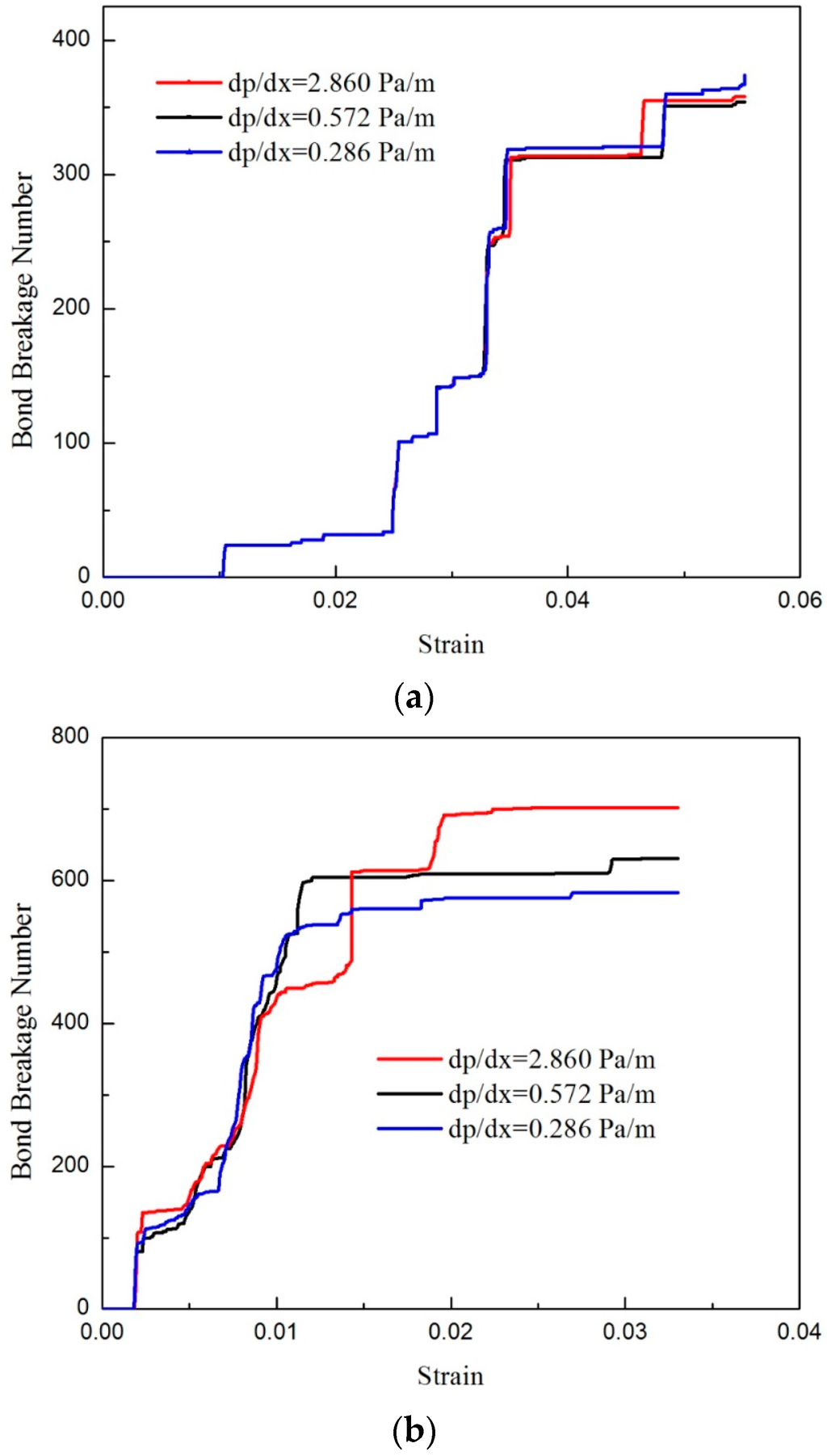 Figure 13 shows the influence of flow rate on accumulative bond breakage in cemented granular media with bond strength of 0.0078 N and 0.078 N. It is observed that the influence of flow rate becomes significant until the strain reach some critical value, which confirms the conclusion that the role of flow in sand production is to erode the localized failure zone [4,5]. Before the critical strain, the cemented granular media is almost intact, and the hydrodynamic force provided by the highest flow rate cannot erode the sample. Therefore, there is little difference between various pressure gradient conditions. After the critical point, the localized failure near the cavity occurs, and the flow erosion starts to take effects, and the coupling effect of mechanical instability and hydro-mechanical instability becomes significant, so the curves of different flow rates begin to deviate from each other.