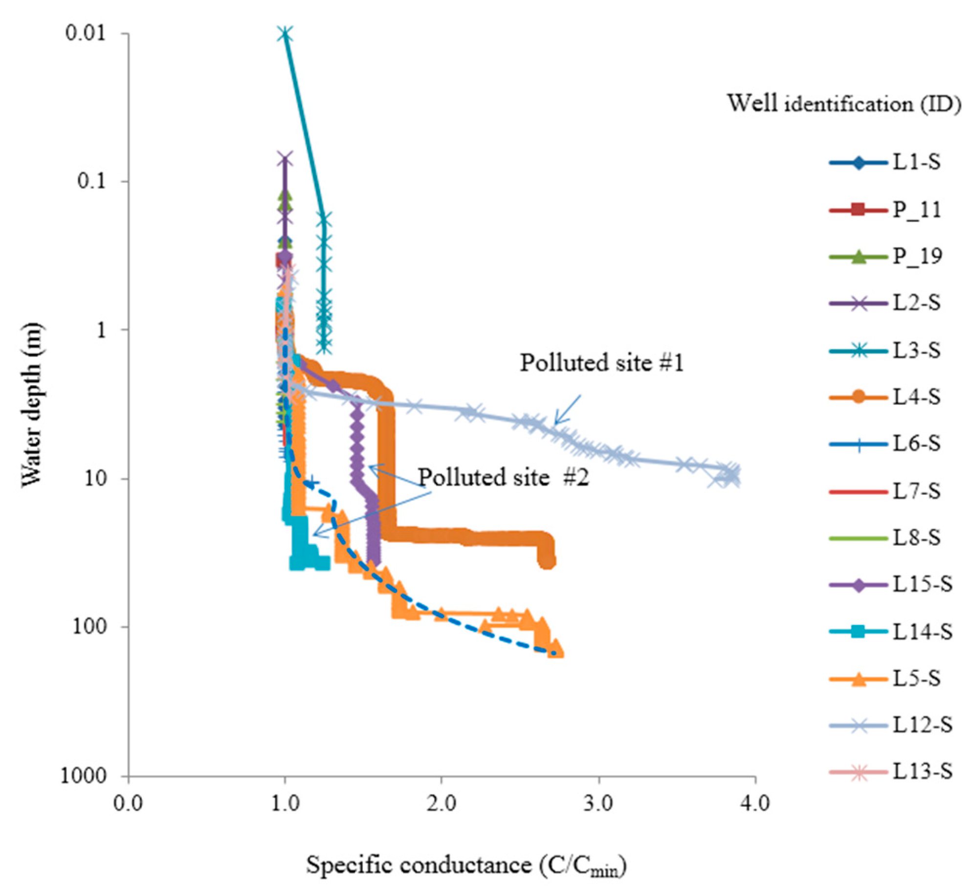 | ID Borehole | Actual (Winter 2012) Groundwater Salinity (g·L−1) at Different Water Depths | ||||||||
