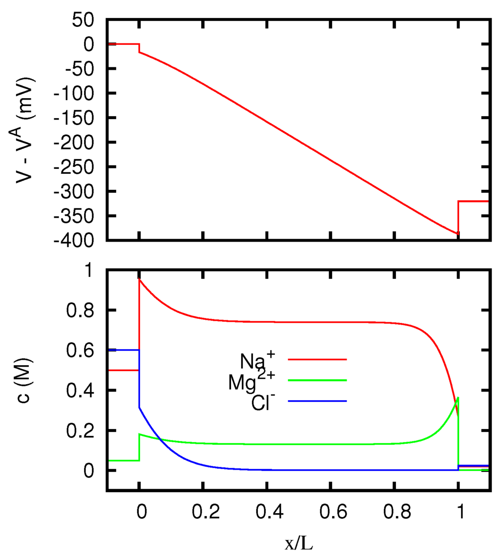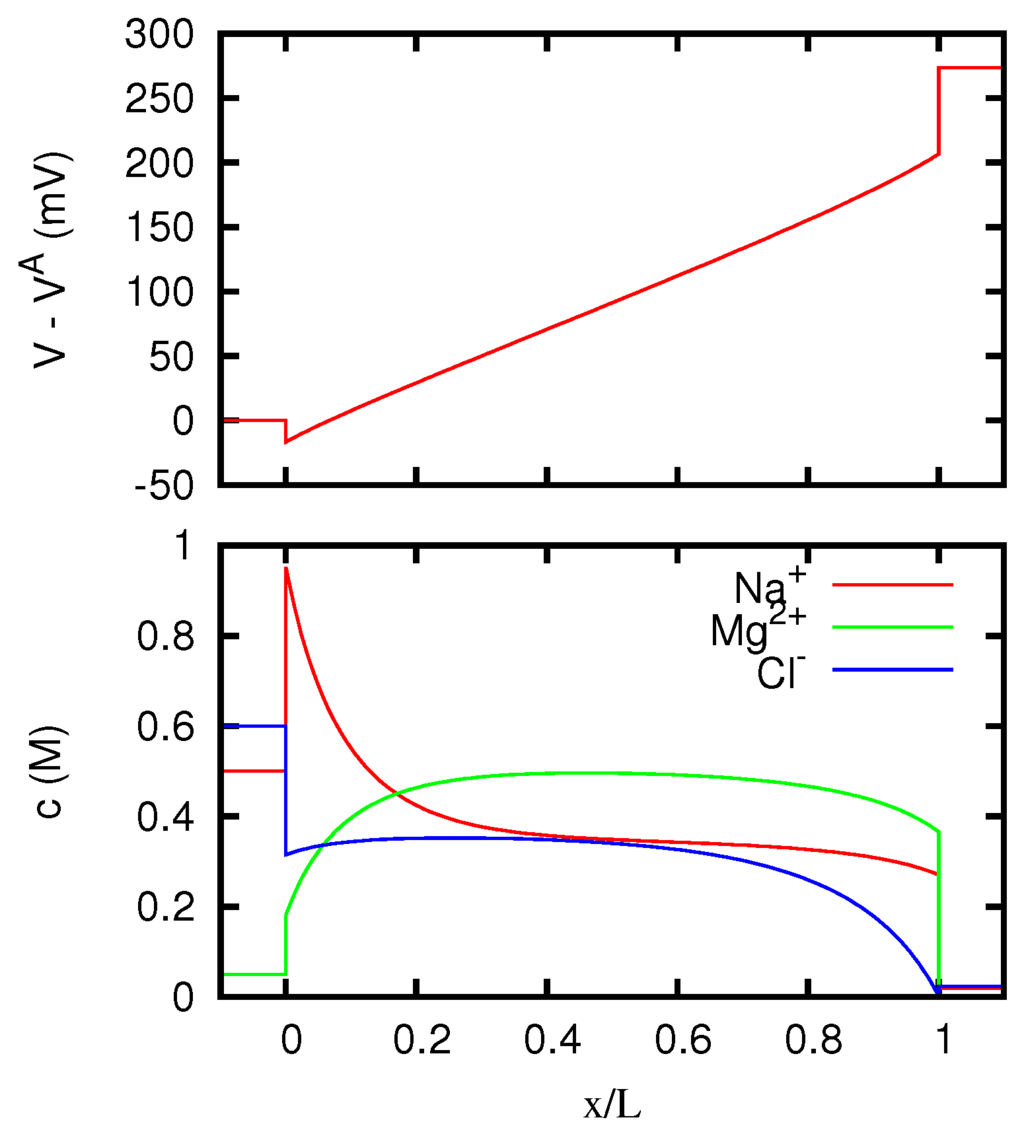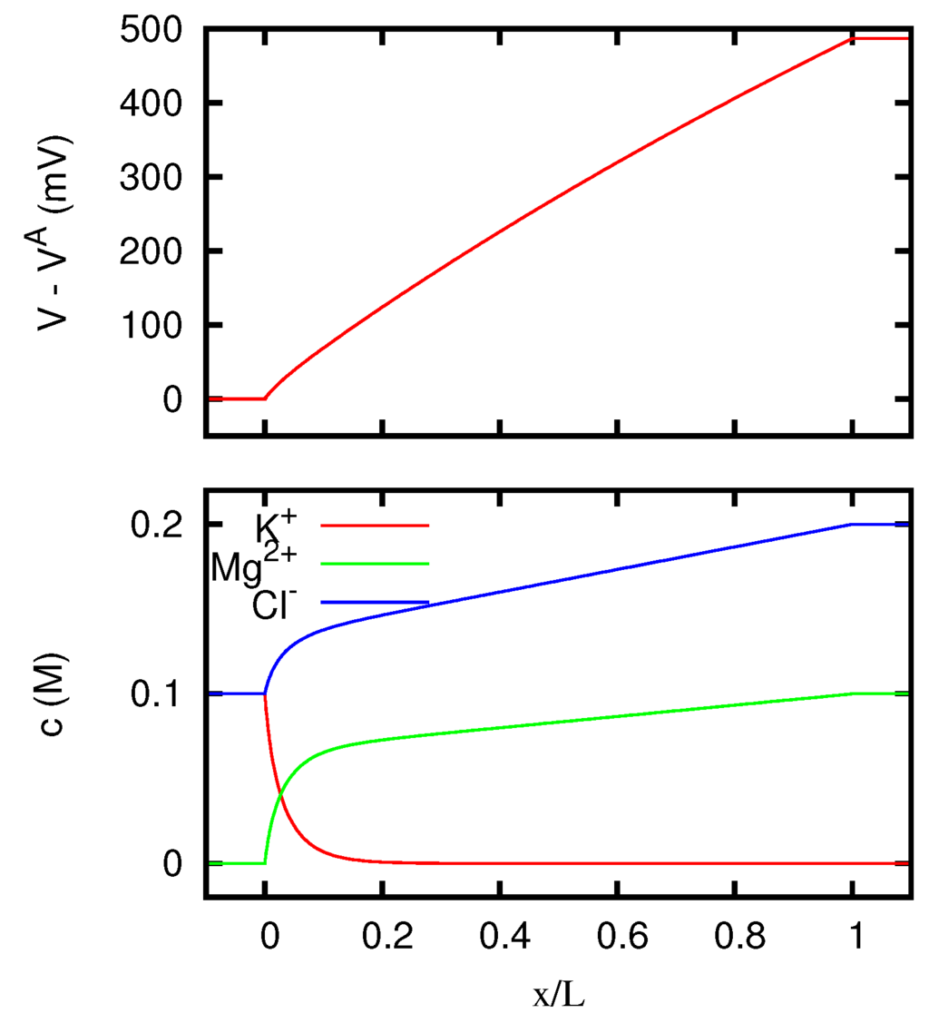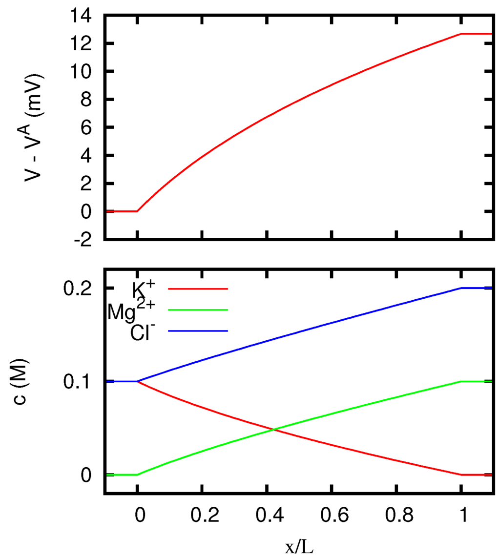 In more recent times, solutions of the Nernst–Planck equations for liquid junctions and membranes have been mainly obtained by means of finite difference numerical integrations, and the development of computers has made possible to treat with these methods a much wider class of situations, including the time-dependent case [17,18,19,20,21]. Several works have also been devoted to the determination of numerical solutions of the full Poisson–Nernst–Planck system. This approach has been used to study the behavior of liquid junctions and membranes in various scientific contexts [9,22,23,24,25,26,27,28,29,30], and in particular in the study of the ions flow across biological cells [31,32,33,34,35,36,37,38,39]. More specifically, the problem of liquid junction potentials has received careful consideration owing to its importance for the correct interpretation of electrophysiological measurements [40].