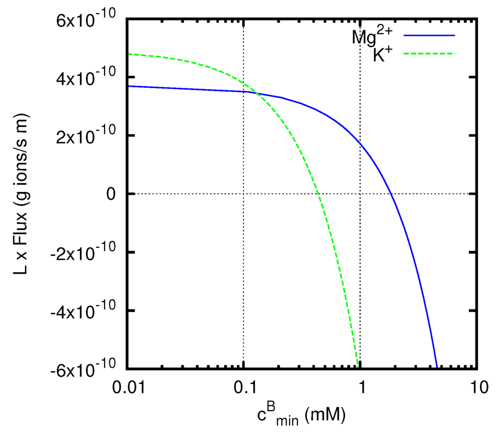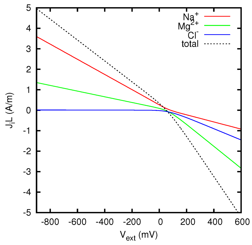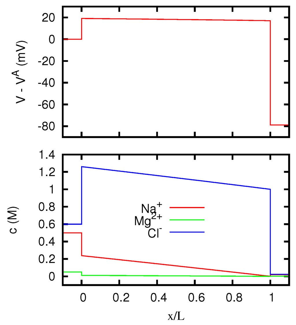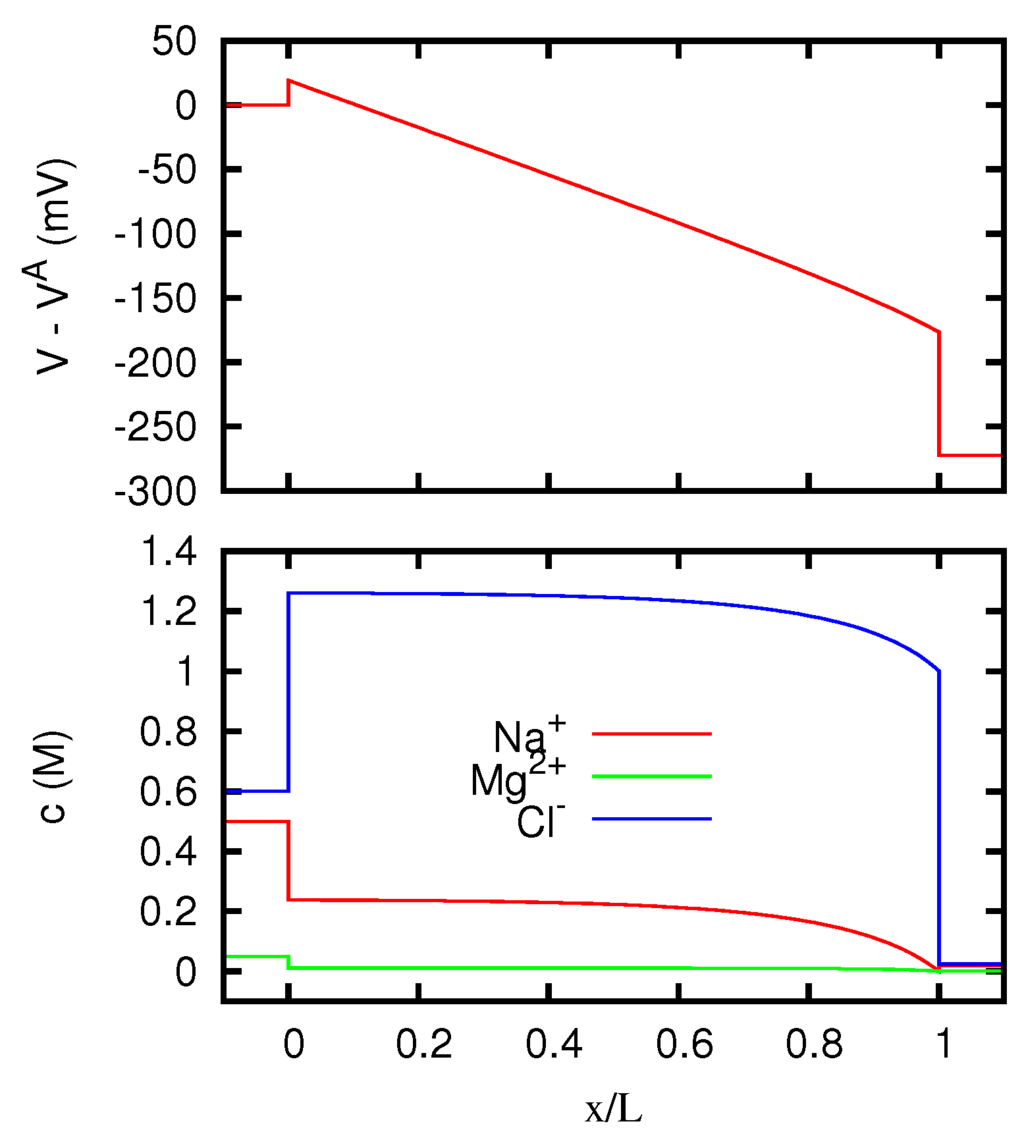 In more recent times, solutions of the Nernst–Planck equations for liquid junctions and membranes have been mainly obtained by means of finite difference numerical integrations, and the development of computers has made possible to treat with these methods a much wider class of situations, including the time-dependent case [17,18,19,20,21]. Several works have also been devoted to the determination of numerical solutions of the full Poisson–Nernst–Planck system. This approach has been used to study the behavior of liquid junctions and membranes in various scientific contexts [9,22,23,24,25,26,27,28,29,30], and in particular in the study of the ions flow across biological cells [31,32,33,34,35,36,37,38,39]. More specifically, the problem of liquid junction potentials has received careful consideration owing to its importance for the correct interpretation of electrophysiological measurements [40].