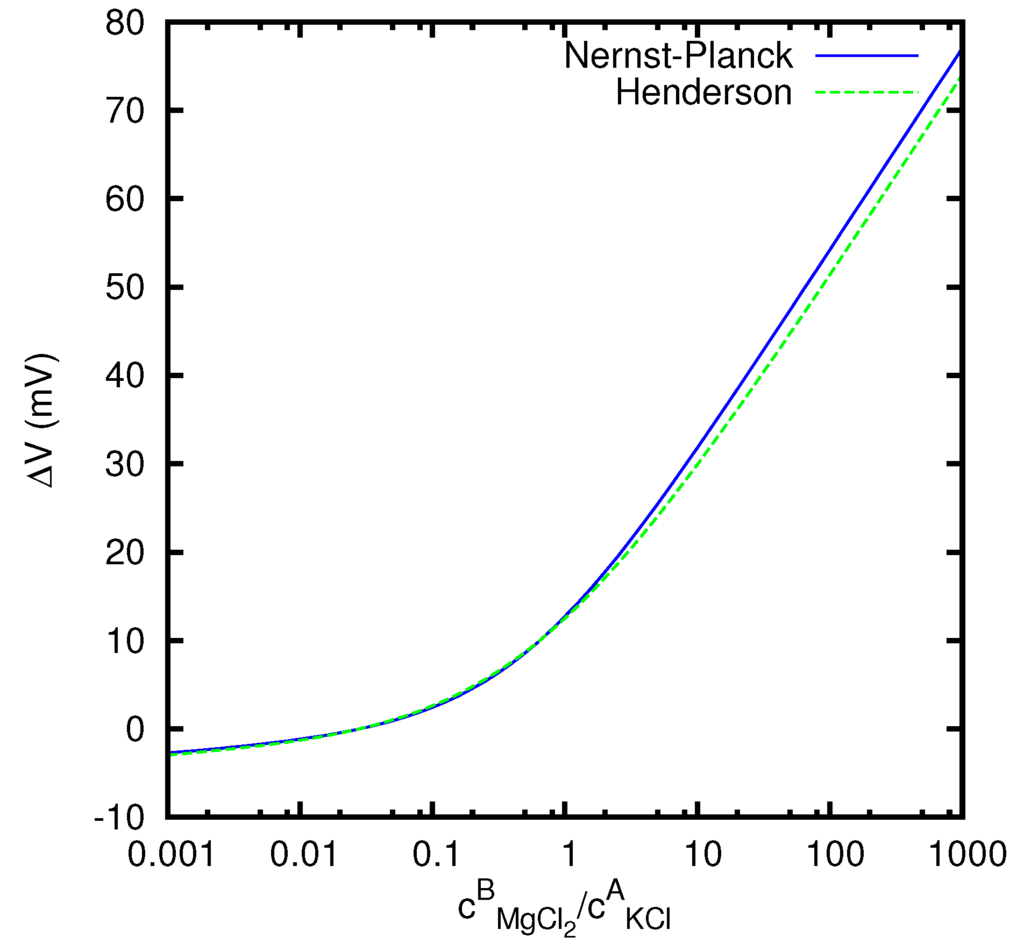 An approximated formula for the junction potential, which gives results sufficiently accurate for most practical purposes, and which is for this reason largely employed still today, has been obtained by Henderson in 1907 [2,3]. A more rigorous approach to the problem had however been adopted by Planck already in 1890 [4,5]. The general behavior of an ion in an ideal liquid junction, which moves under the influence of diffusion and of an electric field, is described by the Nernst–Planck differential equation [4,5,6,7]. Planck obtained an analytical solution of this equation describing the stationary state of an uncharged liquid junction in which only univalent ions are present, under the assumption of local electroneutrality. This assumption means that the Nernst–Planck equations, for all the ionic species present in the junction, are solved with the constraint that the total electric charge vanishes at all points of the junction. In most practically relevant cases the behavior of the electric potential, which is obtained with this method, turns out to be consistent, according to the Poisson equation, with the presence of a charge density which is indeed very low compared with the charge density carried by each individual ionic species. This can be considered as a sound justification for the electroneutrality assumption.