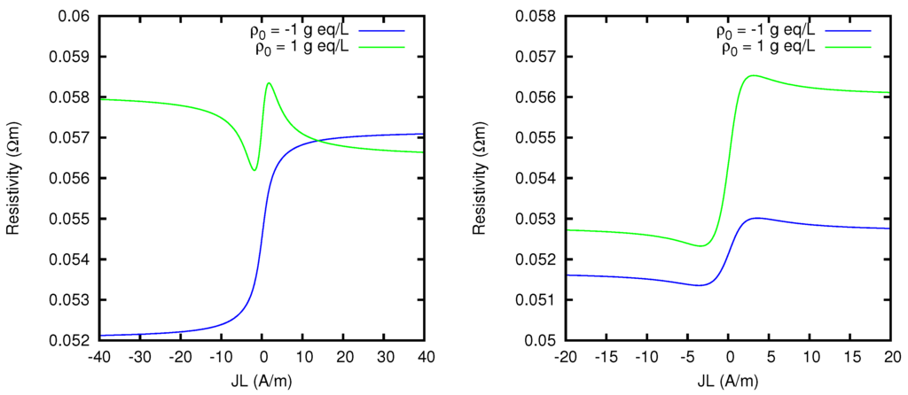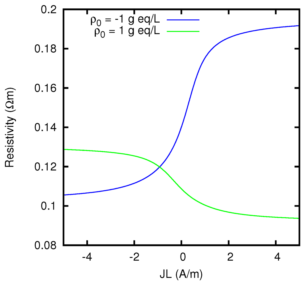 Such a resistivity, for fixed ion concentrations at the two edges, in general depends on the product JL. For , from the definitions Equation (20) of w and Equation (24) of Y one can easily deduce the following expression for the resistivity: