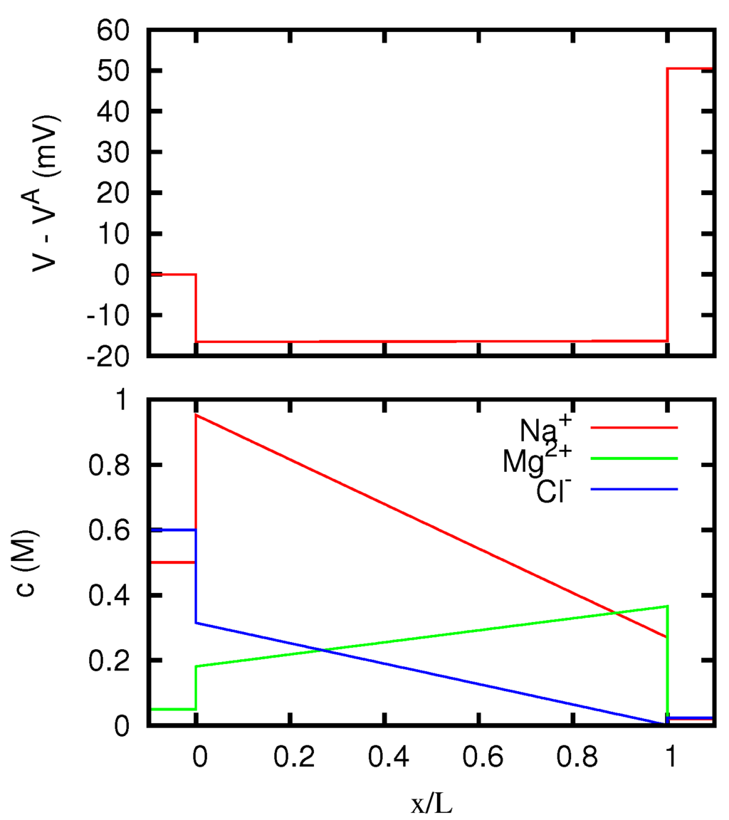 If we assume that the ion concentrations at the two edges of the diffusion layer are given, then all the quantities appearing in Equations (66) and (67) can be expressed as functions of the two only unknown parameters and . For a chosen value of , the former equation can thus be used to determine , and the latter then allows the calculation of the junction potential . Finally, the current density can be obtained as , where the ion fluxes can be expressed using Equation (38) as