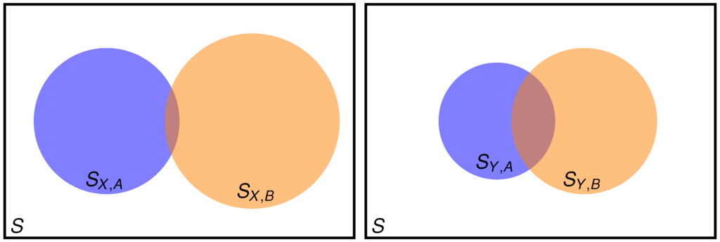 We now consider the case where is better than both for , and . This is schematically represented in Figure 1 by disks corresponding to the subsets . The color of the disks correspond to the properties (blue for property A, orange for property B). The disks in the left panel, corresponding to , are larger than in the right panel, corresponding to , indicating that . However, we do not have any information about the intersection , the number of cases when properties A and B are both well described using method M. We cannot exclude that method X gives “better” results for a larger number of systems and for A and B separately, but that the number of systems for which the results are better both for A and B is smaller for X than for Y: . A similar result is obtained for the probabilities