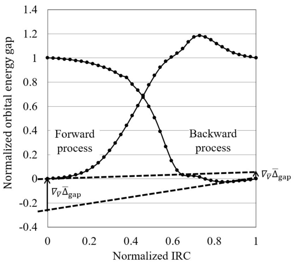 - Finally, the orbital energy gap gradient in terms of the normalized IRCs, , is calculated at the initial reaction stage as a “reactivity index”. Reactions are interpreted to be electron transfer-driven when the orbital energy gap gradient is less than a threshold value, which is temporarily 0.250 in this study.