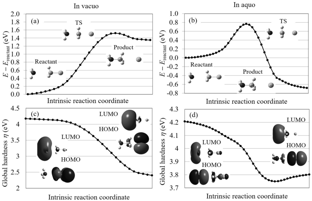 First, we analyzed the Menschutkin reaction (NH + CHCl → NHCH + Cl) using conventional reaction analysis theories. This reaction, which converts neutral reactants into a pair of charged products, is known to proceed only in polar solution. In Figure 5, the calculated potential energy curves on the intrinsic reaction coordinates and the global hardnesses on these coordinates are illustrated for the reaction in gas-phase and in aqueous solution with the molecular structures of the reactants, transition states (TSs), and products and the molecular orbitals contributing to the reactions in the initial processes. The given potential energy curves supports the experimental results that this reaction does not proceed in gas phase because it is endothermic (reaction energy  = 1.35 eV) with very large reaction barrier height (1.52 eV) in gas phase, while it is exothermic ( = −0.68 eV) with relatively small barrier height (0.75 eV) in aqueous solution. The figure also shows that the global hardnesses violate the maximum hardness rule both in gas phase and in aqueous solution. In the figure, the HOMO and LUMO images are also inconsistent with the experimental results for the reaction in aqueous solution because the electron distributions of both HOMO and LUMO are biased to the NH group in the forward process. These results indicate that it is hard for conventional orbital-based reaction analysis theories to interpret this S2 reaction.
