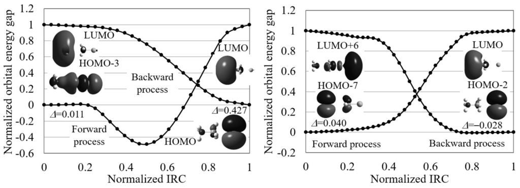 Orbital energies are one of the most prospective alternatives to solve this problem []. Different from molecular orbitals, corresponding orbital energies strongly depend on electron correlation []. However, there had been no theory to quantitatively reproduce orbital energies until very recently. It was recently revealed that long-range corrected (LC) DFT [,] simultaneously provide accurate occupied and unoccupied valence orbital energies []. Combining LC-DFT with the pseudospectral regional self-interaction correction [,], accurate core orbital energies are also given with keeping or improving the accuracy of valence orbital energies []. By using the accurate highest occupied molecular orbital (HOMO) and lowest unoccupied molecular orbital (LUMO) energies, it is found that global hardnesses hardly change in the initial processes of two Diels–Alder reactions on their intrinsic reaction coordinates (IRCs) []. This indicates that these Diels–Alder reactions initially proceed through only electron transfer because outermost orbital energies hardly change by the donation and acceptance of fractional number of electrons [], despite molecular structures change. Based on this observation, Tsuneda and Singh have developed a reaction analysis method based on orbital energies []. As detailed in Section 2, the normalized orbital energy gap, which is the normalized difference between the orbital energies of the occupied and unoccupied orbitals contributing to reactions, is plotted on the normalized IRCs to obtain the orbital energy gap gradient at the reactant structure. The orbital energy gap gradient is taken as the reactivity index to confirm if the reaction initially proceeds through electron transfer. Applying this reactivity index to many fundamental reactions shows that more than 60% of the forward processes make progress through electron transfer, while more than 60% of the backward processes run through structural change. Moreover, anti-activation-energy reactions, which have higher barrier heights in the forward processes than those in the reverse processes, are found to mostly proceed through electron transfer for the forward processes and run through structural change for the backward processes. These results assure the high availability of the orbital energy-based reaction analysis method.