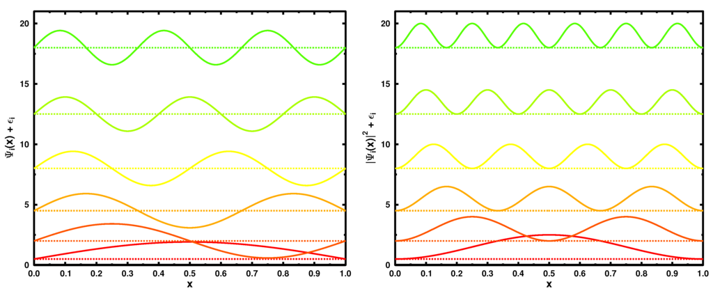 The six lowest in energy wave functions (left) and the corresponding single particle densities (right) for the particle-in-a-box model (L = 1). For illustrative purposes, all curves are shifted by the corresponding energies (see Equation (16)) in atomic units .