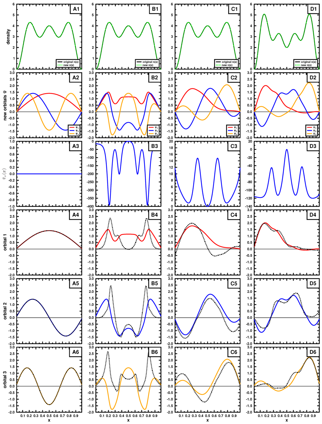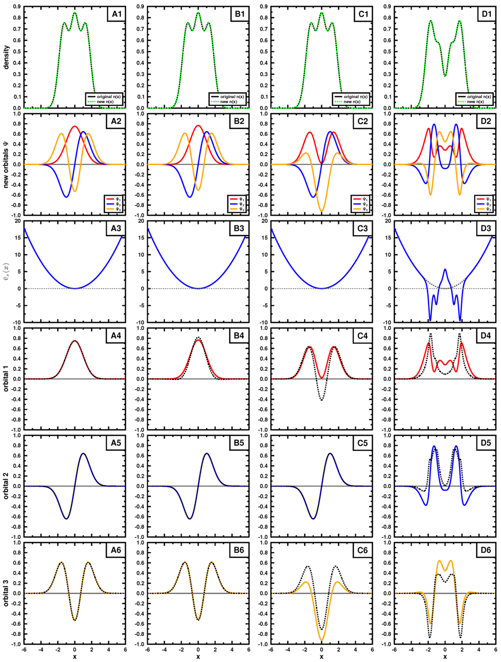 In both examples, the target density (top row) is obtained using the three lowest in energy orbitals (see Equations (15) and (18); ) for panels A,B and C, the density in panel D is constructed by using orbitals 2, 3 and 4. We applied Cioslowski’s procedure [16] for a single Slater determinant using auxiliary functions given in Table 1 and Table 2 to obtain new Slater determinants leading to the given density. Those new orbitals are shown in the second row. If the exact orbitals are used, Cioslowski’s procedure returns the same orbitals (column A); otherwise, different orbitals are obtained. We note that the auxiliary functions do not need to be orthogonal or normalized, as long as they are linearly independent. The new orbitals, although mutually orthonormal, can have quite strange forms, as seen in the second row. They do not even have to obey the symmetry of the problem, nor have a specific number of nodes.