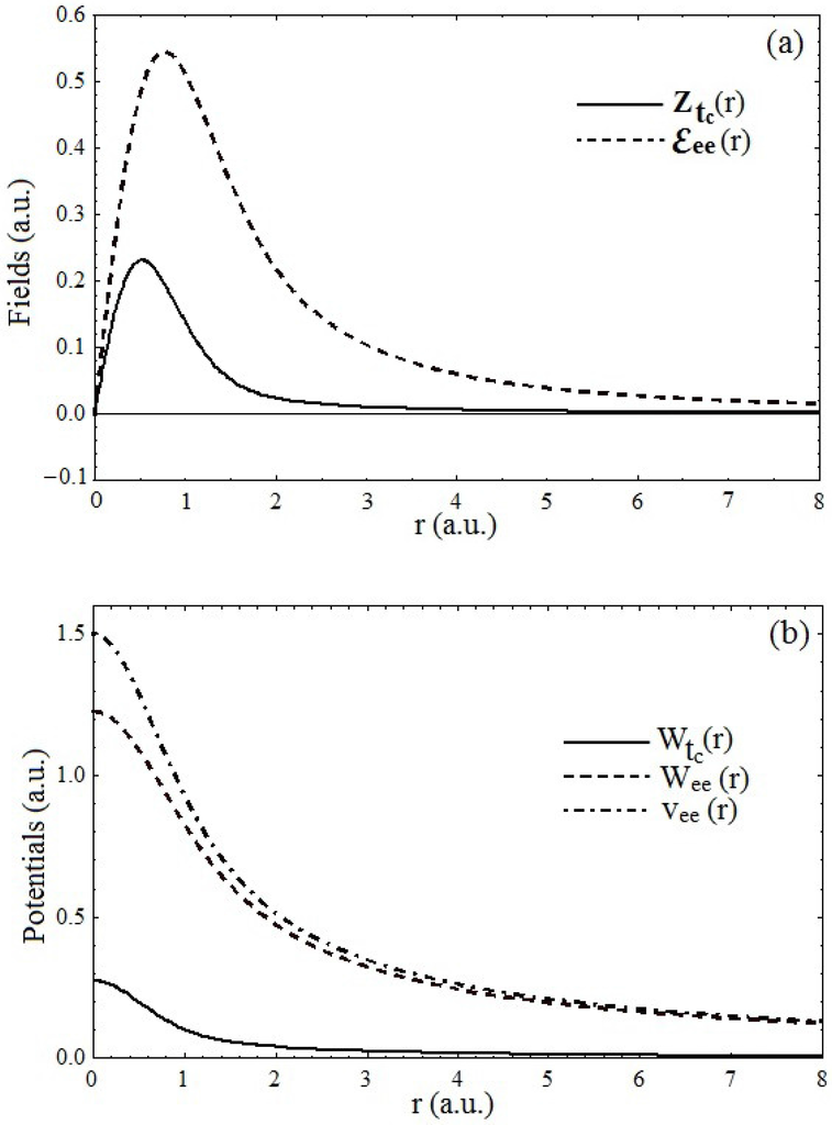 To elucidate the above, we consider the mapping from the ground state of the two-dimensional two-electron quantum dot in a magnetic field [16,17] to one of noninteracting fermions possessing the same also in its ground state. The external scalar potential in the Hamiltonian of Equation (1) is then with the harmonic frequency. The ground [13] state wave function of the quantum dot in the symmetric gauge , is , where , , , , the effective force constant with the Larmor frequency. In Figure 1a, we plot the components and of the effective field of Equation (10). In this example, the fields and are separately conservative. Thus, in Figure 1b, we plot the potentials and , which are, respectively, the work done in the fields and . The sum of and is the local effective electron-interaction potential , which is also plotted in Figure 1b. The local potential then generates single-particle orbitals, which lead to the same as that of the interacting system quantum dot. As a consequence of the reduction in dimensionality, Correlation–Kinetic effects are significant: , , , , . A similar mapping [18] from an excited state of the quantum dot can be accomplished. Once again, it is observed that Correlation–Kinetic effects play a significant role.