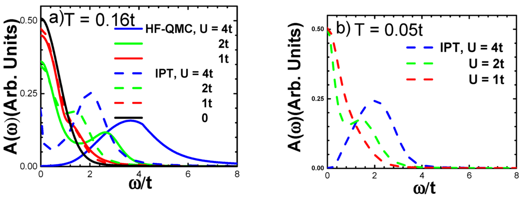 In Figure 3, the HF-QMC and the IPT results for for the one-band Hubbard model for the values of U used in Figure 1 and Figure 2 are presented.