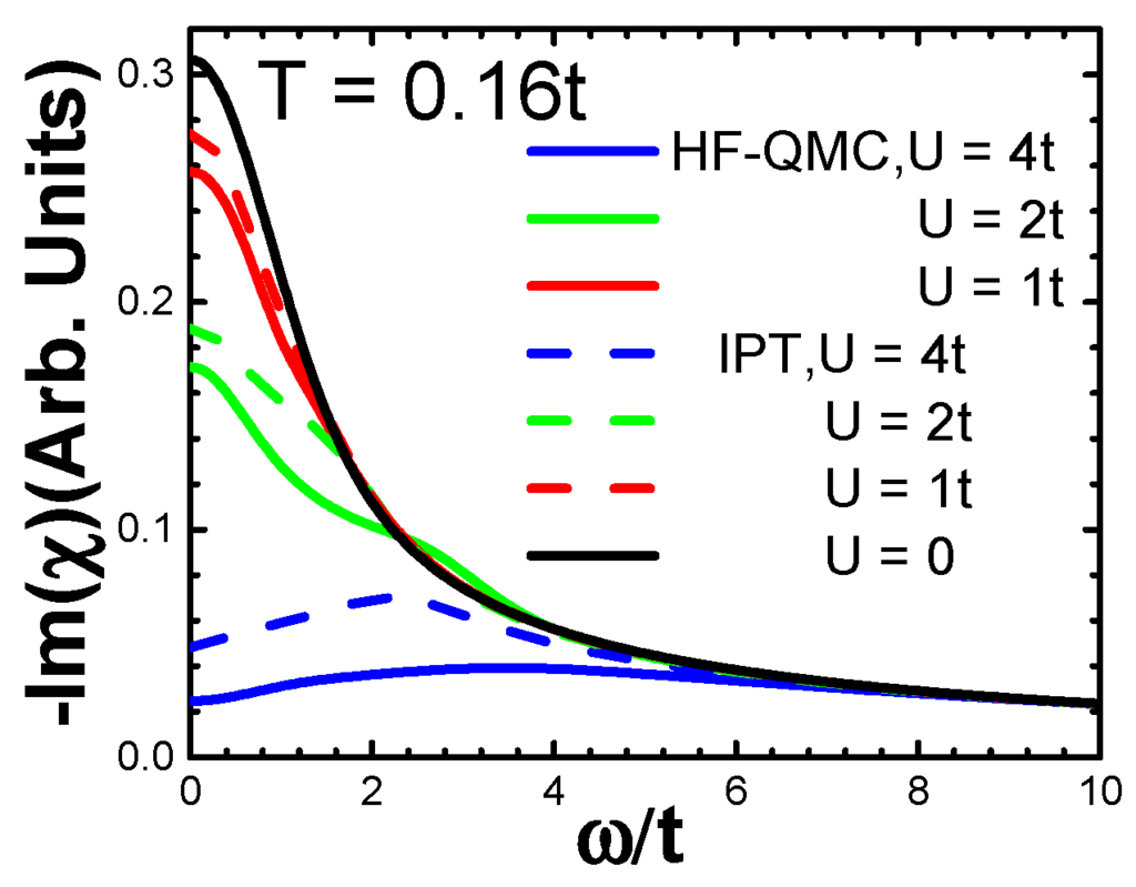 It follows from Figure 2 that the excitation spectrum is in agreement with the DOS of the system. That is, at small U’s (red), the main excitation processes take place around zero frequency (“Fermi level”) states, at which the DOS has the sharp peak. At medium U’s (green), for which the DOS is three-peaked, the excitations mainly take place around the central (“Fermi level”) quasi-particle peak, though now, this peak is much lower compared to the small-U case as a result of reduced zero-frequency DOS. More importantly, such a peak, known to play a very important role in the properties of many SCMs, cannot be obtained with DFT + U and other “non-dynamic” approximations. In addition, there is another pronounced type of the excitations at intermediate U’s, between the left and right Hubbard sub-bands, revealed in the (not very sharp) peak of at . Finally, at large U’s (blue), the excitation spectrum is dominated by the transitions between the Hubbard sub-bands, separated by the energy. Again, qualitatively and semi-quantitatively, the HF-QMC and IPT results are rather similar, which is not surprising since they are the consequence of very similar results for the DOS in Figure 1.