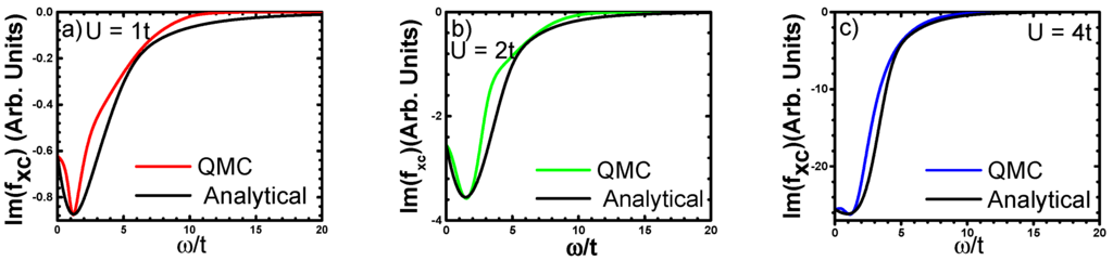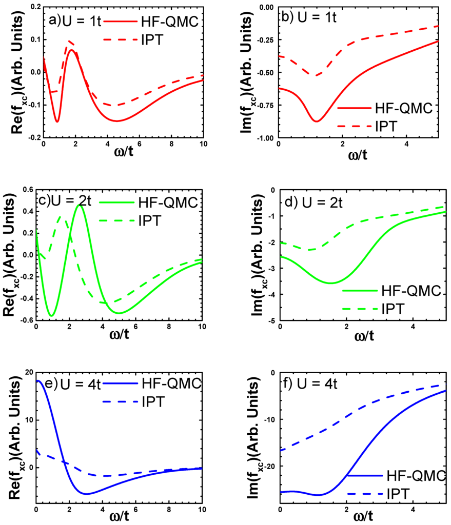 One can make several conclusions about the qualitative frequency dependence of the XC kernel: (1) the magnitude of the kernel grows with U; (2) the real part of XC is a decaying oscillating function of frequency with the oscillation period proportional to U; (3) its imaginary part has one peak at a frequency and also decays at large frequencies; (4) in all cases (surprisingly), both the real and imaginary parts decay with approximately the same decay constant . Again, the IPT and the HF-QMC results are in a good qualitative and semi-quantitative agreement with each other.