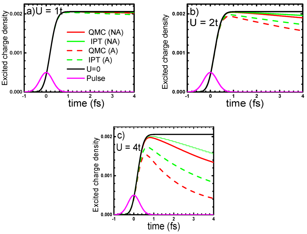 On comparing the results for the system response for different XC kernels, one can find from Figure 5 that the HF-QMC gives a faster relaxation of the system, though the order of the timescales of the excitation and relaxation stages for both HF-QMC and IPT solutions are the same.
