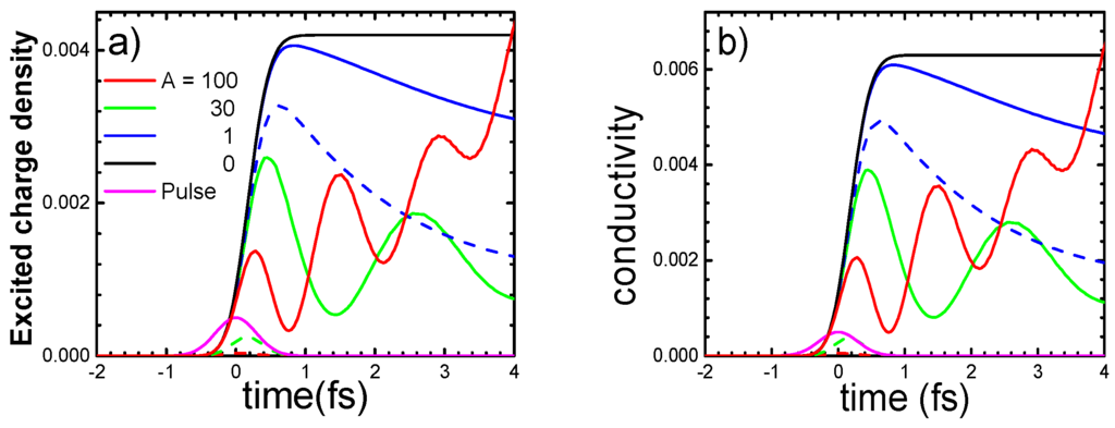 One can see from Figure 6a that at small A, the relaxation time decreases with increasing A, which is natural for the linear response regime (the relaxation time is inversely proportional to the strength of the effective electron-electron interaction described by the XC kernel). With the further increase of A, the system response transforms from a monotonous decrease of the excited charge density to a decrease with beatings (green curve) and even to a nonlinear growing of the excited charge density with beatings at very large A (red curve). Of course, only further experimental testing will allow one to estimate the values of the parameter A relevant to YTiO3. Using Brugemman’s theory of conductivity [57], in which the current is proportional to the fraction of the metallic area of the excited insulator or to the excited charge density, one can easily find these beatings also in the time-dependent conductivity (Figure 6b). Similar to the previous subsection, the beatings can be explained by the charge transitions between singly-occupied and empty orbital levels, i.e., by dynamical effects. As one can see from Figure 6, the results for the conductivity obtained with the adiabatic kernel do not show this effect.