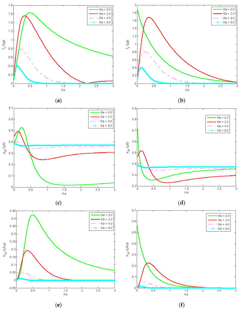 - Ursell, F. On the heaving motion of a circular cylinder on the surface of a fluid. Q. J. Mech. Appl. Math. 1949, 2, 218–231. [Google Scholar] [CrossRef]