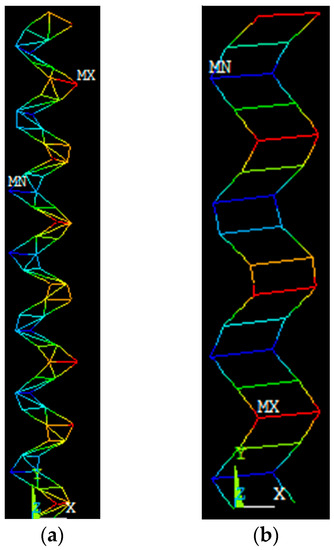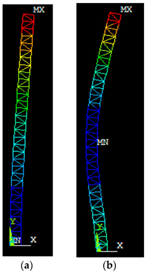 Figure 4. Mode shapes for the natural frequencies. (a) The first mode shape with a modal frequency of ; (b) the second mode shape with a modal frequency of . - Hysteretic damping:The dynamic stiffness matrix is demonstrated as:
