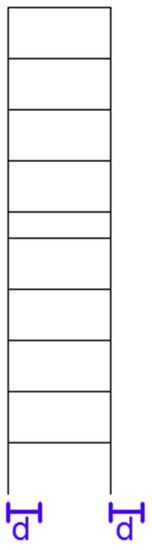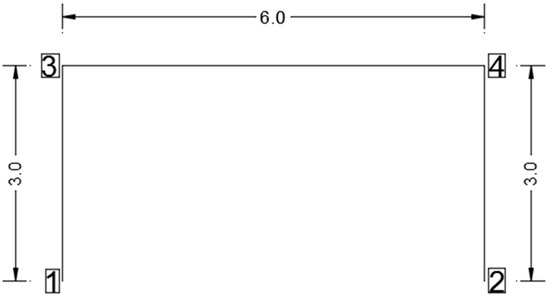 Frames are structures that have a combination of beams resisting loads. Such structures are modeled to overcome large moments developed due to the applied loading. The connected node acquires three DOF, preventing displacement in the y-direction and rotations in the x- and z-direction. A building under seismic load is modeled as a frame. Timoshenko beams will be studied, having four degrees of freedom. The cross-sectional dimensions of all frame elements and the repeated cell are illustrated in Figure 7 and Figure 8, respectively. The cell will be repeated 16 times with a total length of .
