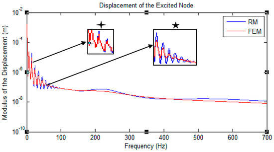 The results for the two different applications under harmonic vibrations showed that RM calculated values are close, but slightly higher than the values of the FEM. For low and high frequencies, the modulus of displacement of the RM showed nearer values than at frequencies that cannot be considered as high. Note that the finite element analysis was taken as the reference method. The percentage difference between the two approaches for the two applications is established in Table 5.