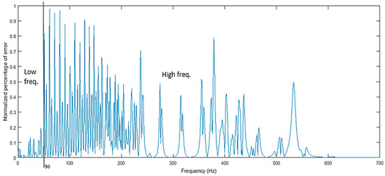 Normalized percentage of error between FEM and RM for a range of frequencies.