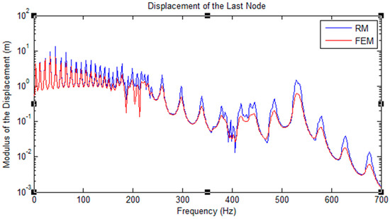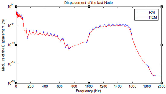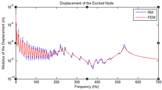 The results found using the recursive method and the conventional finite element software (ANSYS) for determining the frequency response function are presented in Figure 14. It displays the logarithmic varying displacement of the first bottom node that is excited under harmonic displacement. The modulus of displacement is studied for a range of frequencies.