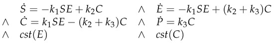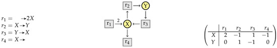 - Fages, F.; Gay, S.; Soliman, S. Inferring reaction systems from ordinary differential equations. Theor. Comput. Sci. 2015, 599, 64–78. [Google Scholar] [CrossRef]