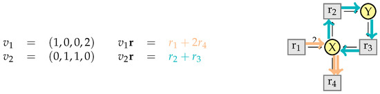 - Let be a flux-path for W such that, for any intermediate species X, . Again, because , is also a flux-path for . By induction hypothesis, there is a corresponding flux . If is not the flux that is removed by the application of (C-Dep), then this flux still occurs in W (possibly with an updated kinetic) and we conclude directly. We now show that it can not actually be otherwise, and more precisely, that assuming v removed by (C-Dep) contradicts .Suppose that v is removed by (C-Dep), then v depends on some fluxes in . For the sake of simplicity, we only consider the case where for some intermediate . The other case works similarly. We necessarily have , because contradicts the linearity assumption. By induction hypothesis and Point 3, there exists in particular at least one j such that . Again, by induction hypothesis, there exists a circular flux-path corresponding to in . Since it is circular, there exist some intermediate species such that for any , and , and , . Note that we also have , since, by definition of flux-path, for any i, while . Since and , the unit vectors also appear in the flux-path . So the intermediate species are present at least one time in . Moreover, there is at least one i such that in , the unit vector is preceded by a unit vector that is not one of . Therefore, is produced by another flux, i.e., , which contradicts the hypothesis.