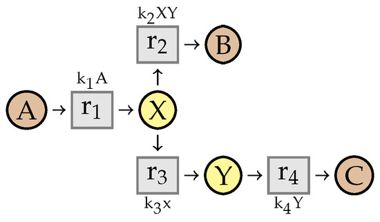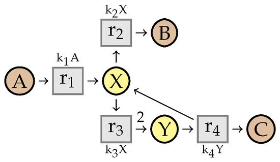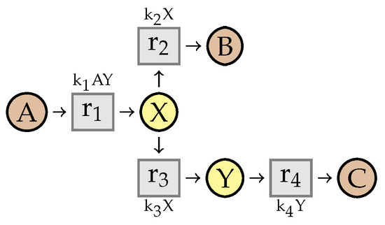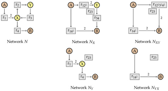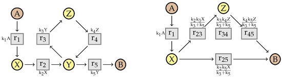 - Sáez, M.; Wiuf, C.; Feliu, E. Graphical reduction of reaction networks by linear elimination of species. J. Math. Biol. 2017, 74, 195–237. [Google Scholar] [CrossRef] [PubMed]