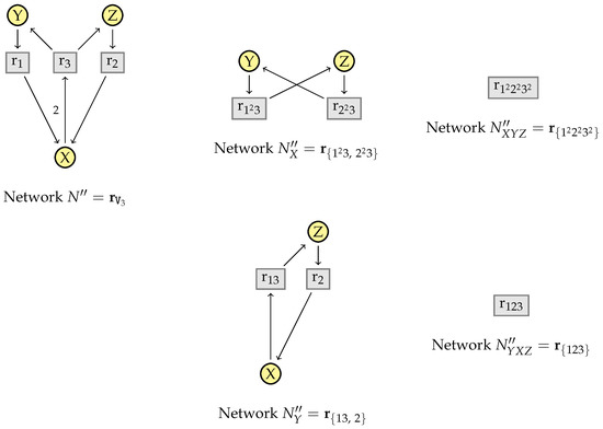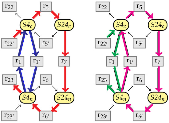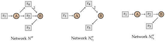 - Let be a flux dependent on , that is, in particular, for some . Since (C-Dep) removes one flux and possibly modifies some kinetics, there is a flux in that either depends on or on where is the flux removed by (C-Dep). The latter case is not possible, since it would imply that for some and unary vector . Thus, we conclude that depends on that, by induction hypothesis, satisfies the conditions of Point 3.