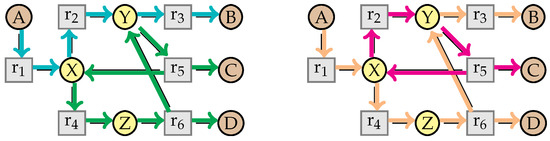- if is circular, there exists an intermediate species Y which is both consumed by and produced by . The flux-path cannot be circular, as this would imply , and similarly for . By definition of non-circular flux-path, X and Y are the only two species in and such that and . Thus, Y is the only non-eliminated intermediate species in w.r.t. W, meaning again that is indeed a circular flux-path.