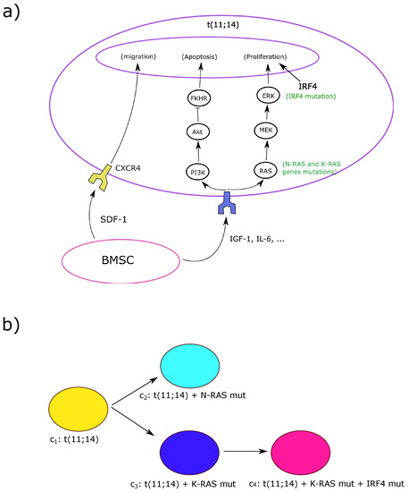 (a) The intracellular regulation of myeloma cells as described in the model. Bone marrow stromal cells (BMSCs) secrete the cytokines insulin-like growth factor 1 (IGF-1), interleukin-6 (IL-6), and chemokine stromal cell-derived factor 1 (SDF-1) which are necessary to the survival, homing and proliferation of myeloma cells. Via their respective receptors, IGF-1 and IL-6 activate the RAS/ERK pathway which promotes the cell proliferation. They inhibit apoptosis through the phosphatidylinositol-3 kinase/protein kinase B/Forkhead in rabdomyosarcoma (Akt/FKHR) pathway. The cell migrates and homes to BMSCs through the SDF-1/CXCR4 axis. The IRF4 mutation, which has been associated with concomitant RAS mutations, promotes survival and proliferation. BMSCs, which are much larger cells than the myeloma cells, are shown in reduced in size in this figure as well as the receptors of both IGF-1 and IL-6; (b) The parallel evolution pattern of multiple myeloma clones resulting in intra-clonal heterogeneity. More aggressive clones result from a more aggressive N-RAS mutation in clone 2 or the acquisition of IRF4 mutation in addition to the less aggressive K-RAS in clone 4. Each clone is shown by its corresponding color in the model.