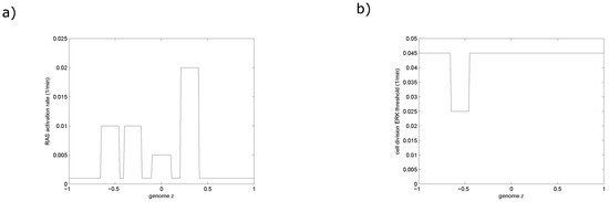 (a) The activation rate of RAS protein as a function of the genotype function z; (b) The ERK threshold for division as a function of the genotype function z, it decreases due to the IRF4 mutation found in the clone .